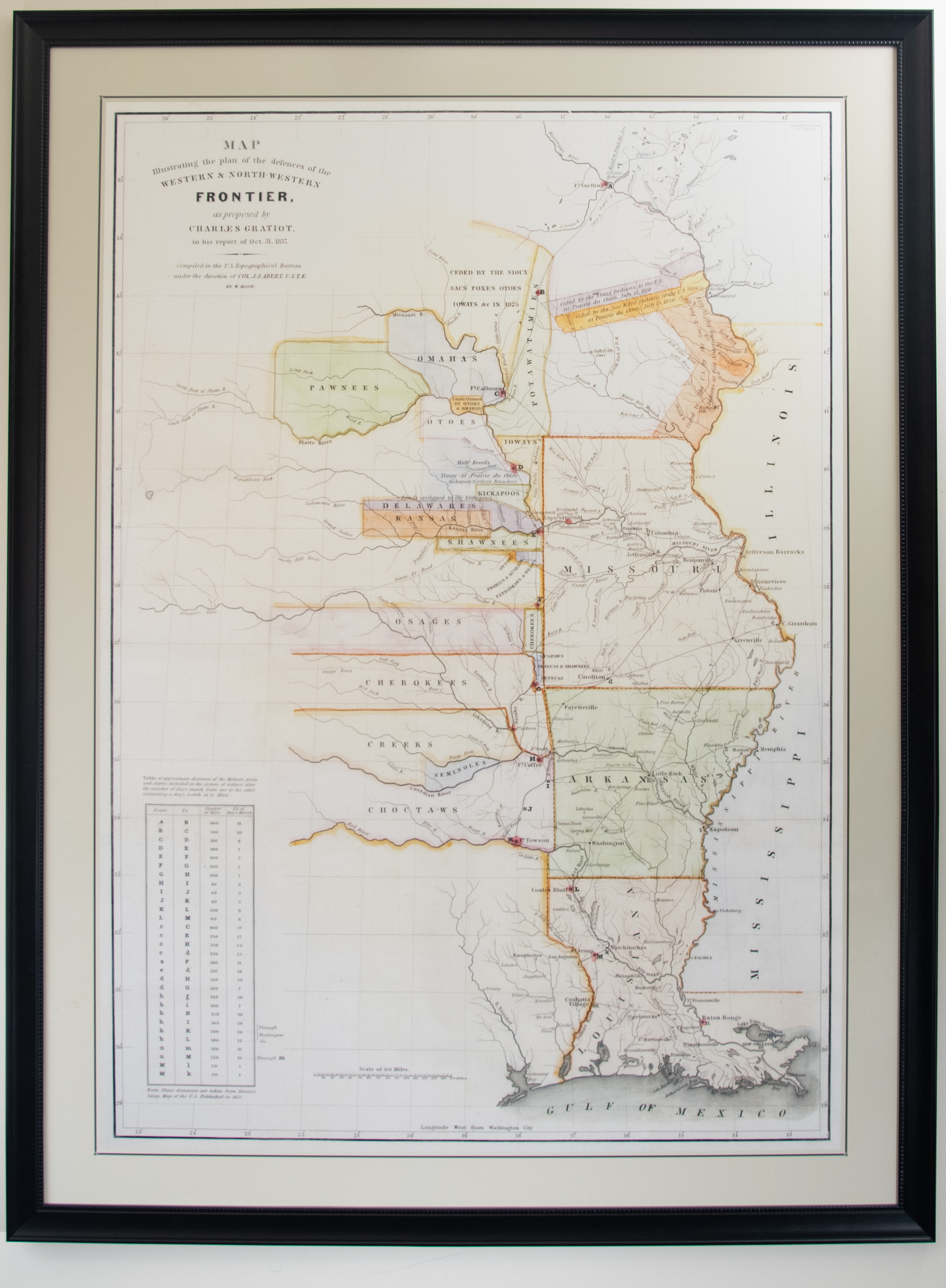 As stated on the upper left hand corner of the map, this map illustrates "the plan of the defences of the Western and North-Western Frontier, as proposed by Charles Gratiot, in his report of Oct. 31, 1837." The Frontier is at the western edge of the central Midwestern states: Iowa, Missouri, Arkansas, and Louisiana. The Frontier is further defined by the regions inhabited by various Native American tribes who encountered the US military. Colonel Charles Gratiot compiled this information under the direction for the US Topographical Bureau under the direction of the head of the United States Corps of Topographical Engineers at that time, Colonel. J.J. Albert. As labeled cities and states dwindle to sole river names and Native American tribe regions, one gets an idea for the unfamiliarity of the land yet untouched past the Frontier.