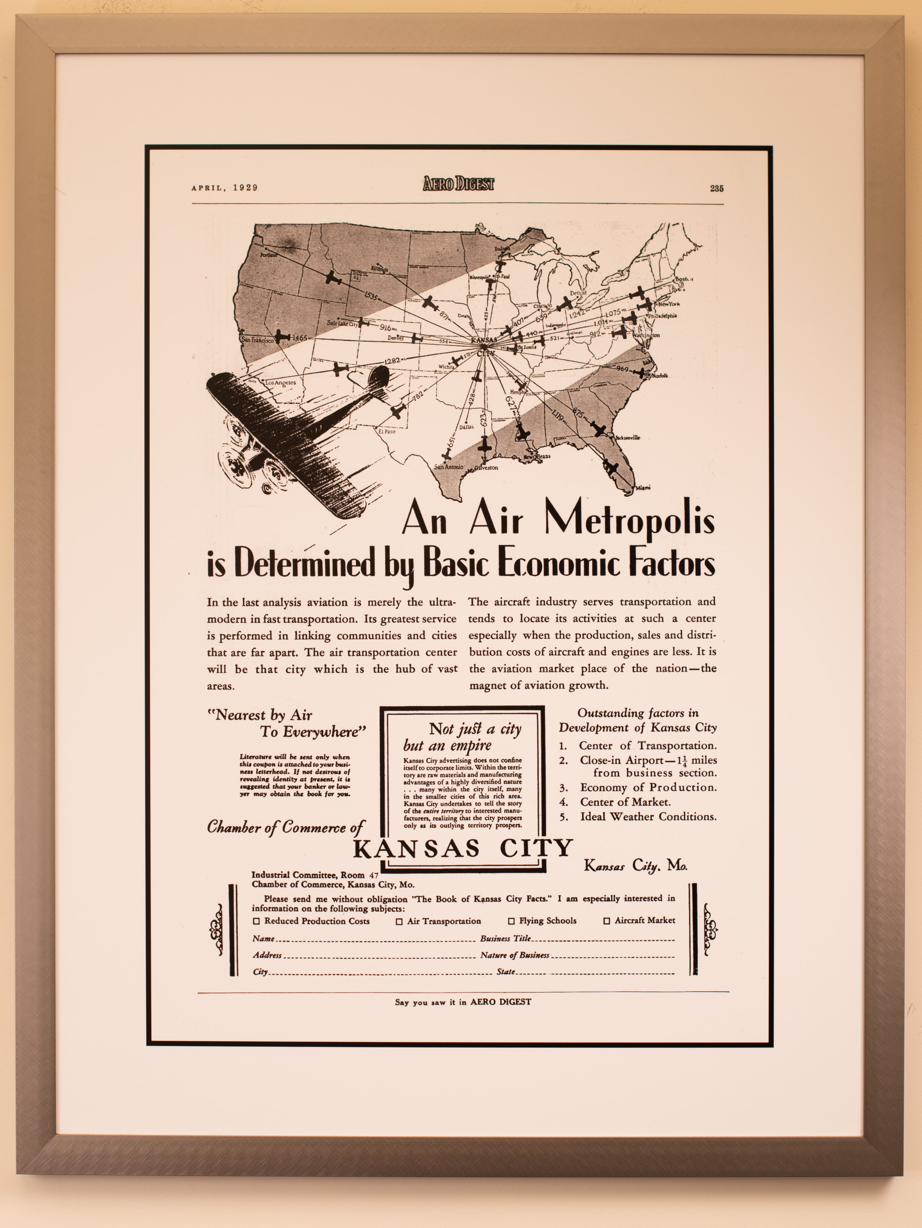 This image is from a page of the April 1929 issue of Aero Digest- a professional periodical covering the aircraft industry. The article focuses on the economy of the growing air transportation industry and Kansas City's potential to be the next "air metropolis". The article shows via a graphic representation that Kansas City's central location within the country gives it an advantage in the industry by being the "hub of vast areas". The image shows small planes radiating out from Kansas City to others all over the country. Next to each plane is the flight distance in miles, and the relatively small numbers fortify the claim below that the Midwestern city is "Nearest by Air to Everywhere". One large plane passes over the image, illuminating Kansas City and its planes in its path. Location tops the article's list of the outstanding factors that contribute to the development of Kansas City, along with its close-in airport, economy of production, and ideal weather conditions. The article was written by the Industrial Committee of the Chamber of Commerce of Kansas City, Missouri, and provides a section at the bottom for readers interested in receiving facts about reduced production costs, air transportation, flying schools, or the aircraft market can fill out with their information and send back to the committee.