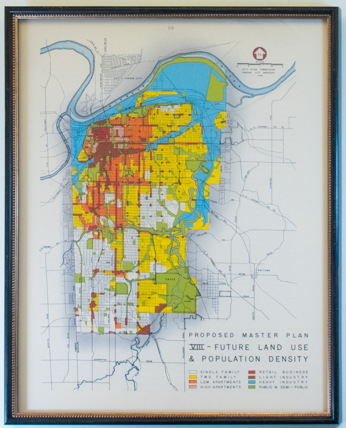 This is the eighth proposed master plan for future land use and population density in Kansas City generated in 1946. The gridded map indicates single and two family housing as well as low and high apartments, retail business, light and heavy industry areas, and public and semi-public areas. Each element is color or pattern coordinated and corresponds to a legend in the lower right-hand corner of the map.