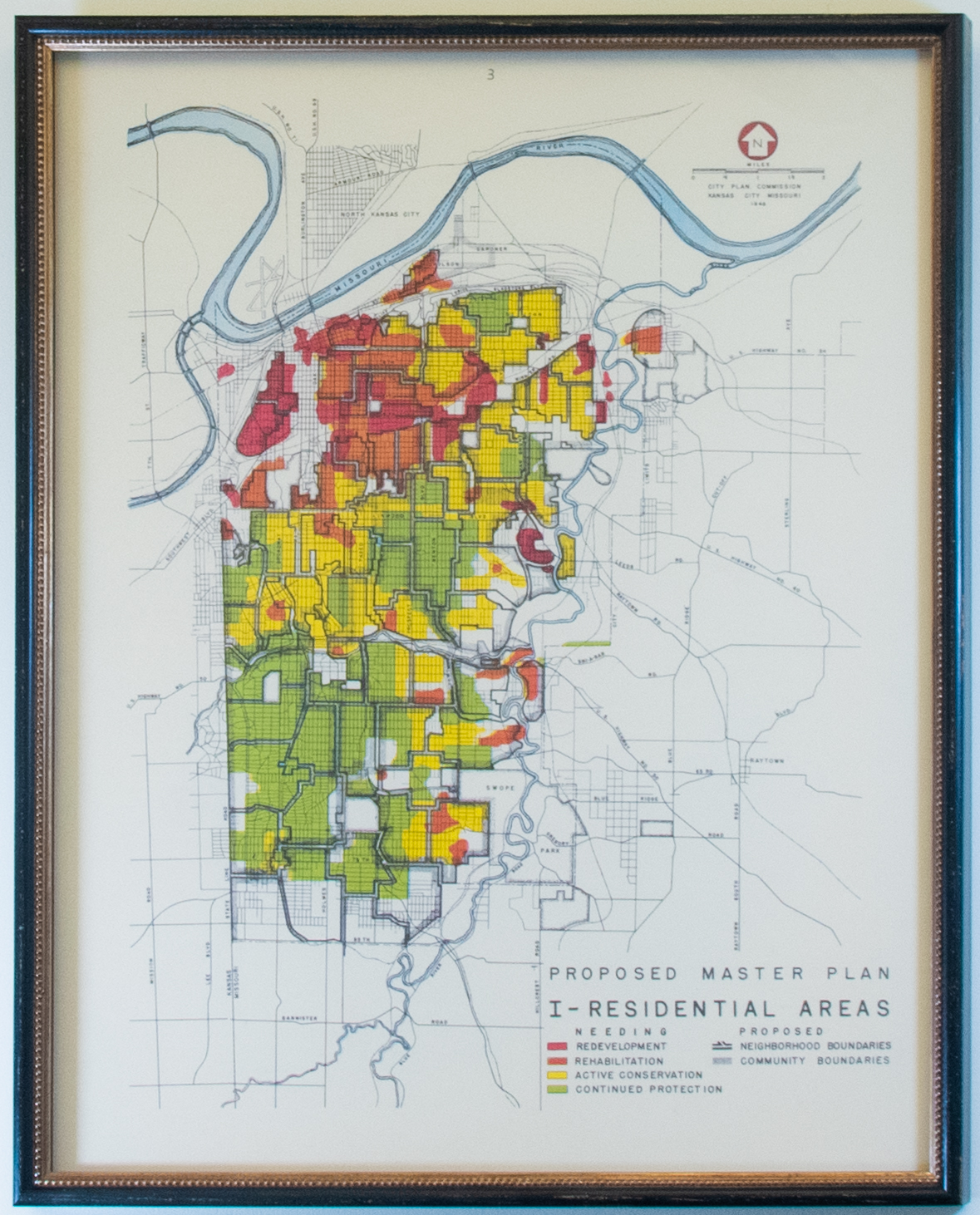 This is the first proposed master plan for residential areas in Kansas City generated in 1946. The gridded map indicates needed redevelopment, rehabilitation, conservation, and protection along with proposed neighborhood and community boundaries. Each element is color or pattern coordinated and corresponds to a legend in the lower right-hand corner of the map.