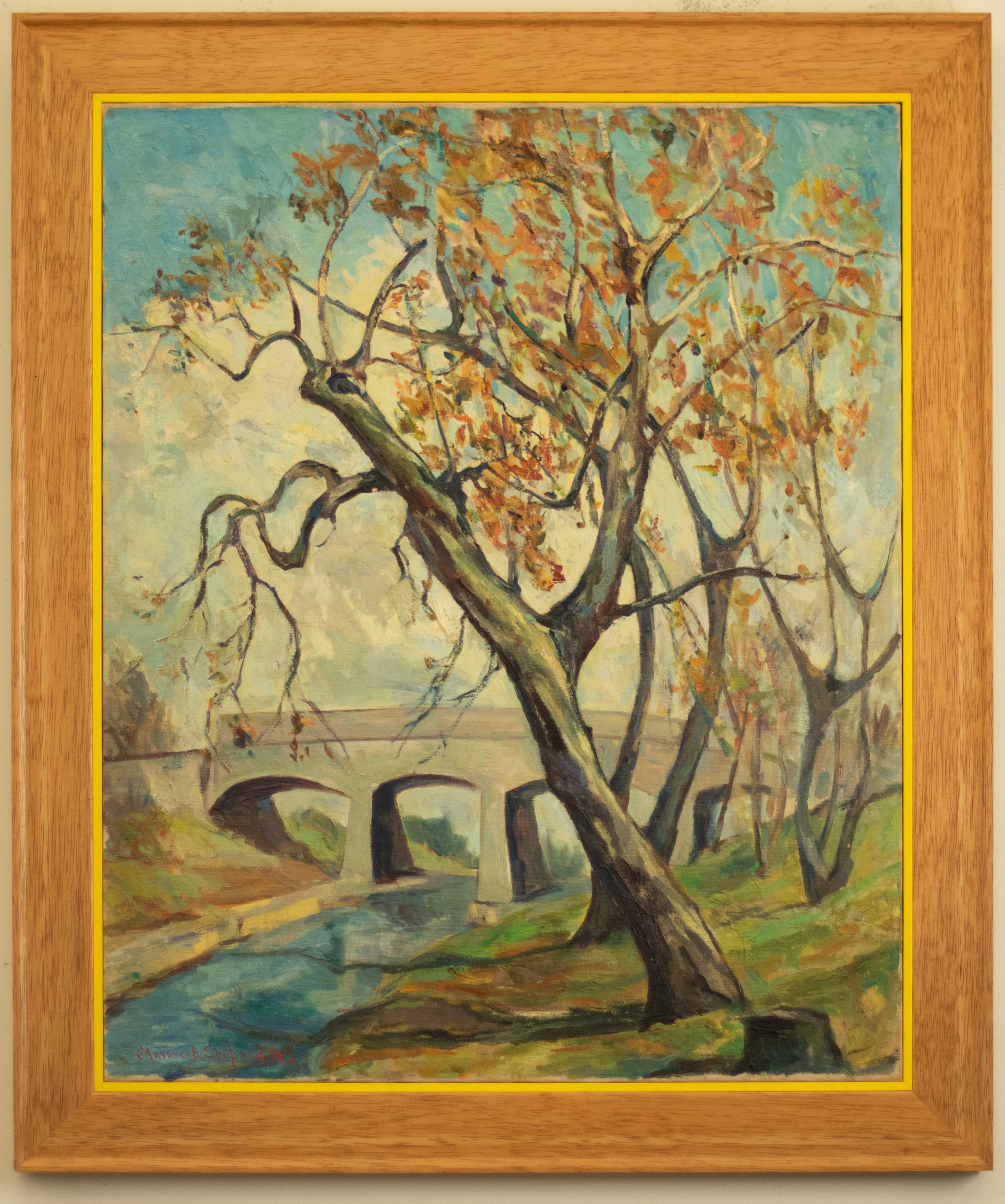"Abstract Tree" is a very good example of Shepard's subject matter. Landscapes, particularly autumn scenes, play the central role in many of his works. This painting depicts a row of trees running alongside a river. Architecture never far away, Shepard includes a triple arched bridge on the horizon giving a place for the river to flow. He uses russet tones to accent the feeling of autumn with hues and shades of blue, yellow, green, red, and purple. The painting is signed in red paint along the lower left side and dated 1942, just seven years before his death.