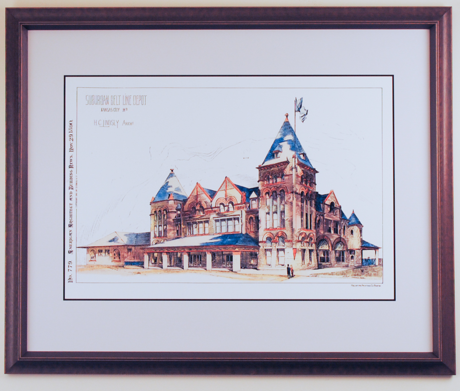 This cover of the American Architect and Building News periodical features the Suburban Belt Line Depot in Kansas City, Missouri designed by architect H.C. Lindsly. The structure shown was originally rendered in pen, ink and watercolor. The integration of sketched lines, calculated detail and imaginative coloring show off the architectural qualities while also conveying the structure's potential in space. The building was styled in a Victorian/Renaissance Revival style with a series of monumental towers topped by pyramidal roofs. Soaring towers, voussoired window sequences and calligraphic ornament seem to elevate the building while stone masonry and heavy roofing anchor it to the ground. Two figures stand before the main tower, their relatively small size emphasizing the impressiveness of the structure. The periodical that featured this architect's work began publication in 1876 cataloging the field's latest until 1908 and completed 95 volumes.