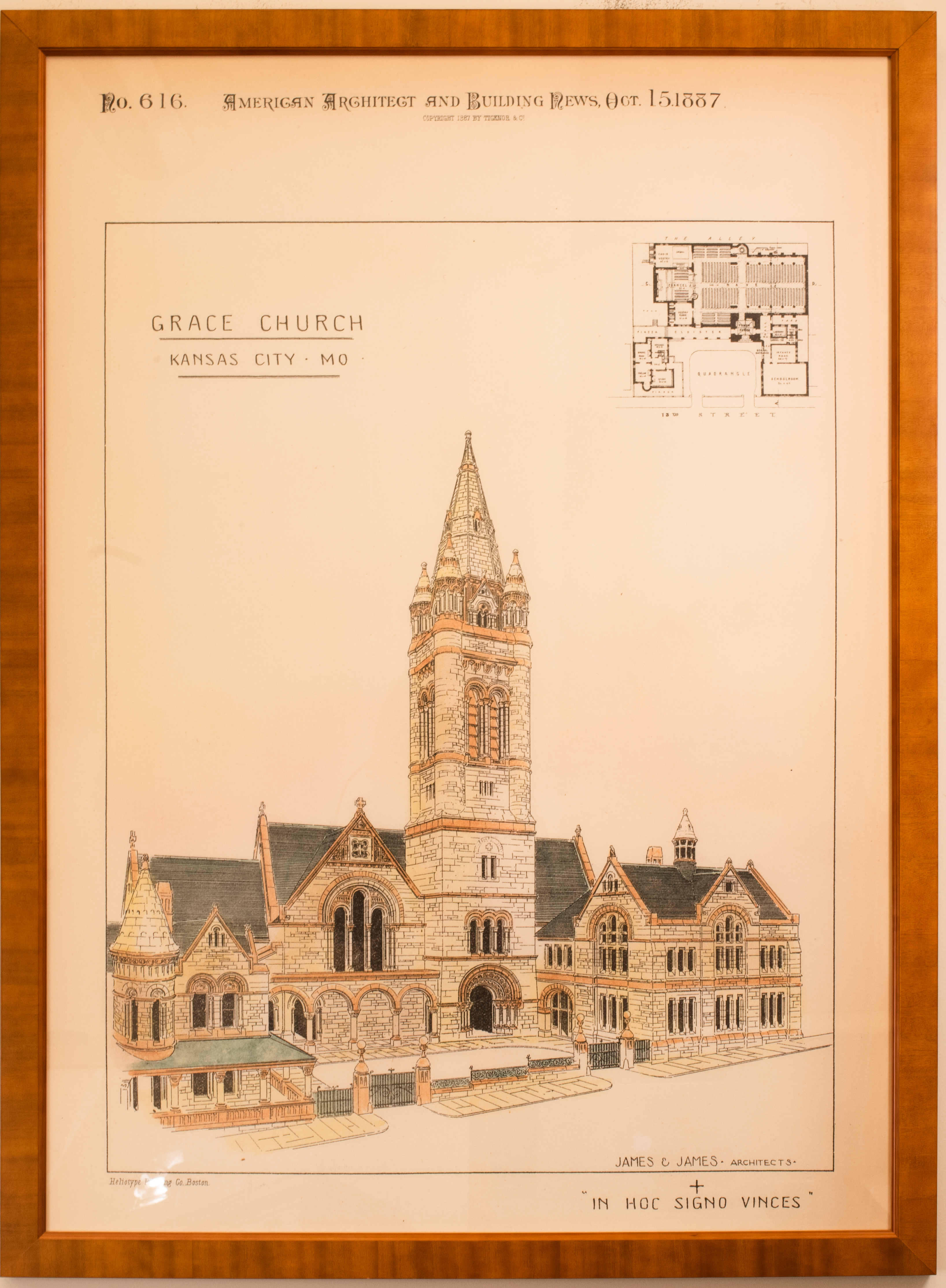 This print is an architectural drawing of Grace Church, a Catholic church designed by architectural firm James and James. This drawing was an entry for the 1887 design competition for the church, although the entry chosen was Frederick Elmer Hill's, an architect in the New York firm McKim, Mead & White, and exists in Kansas City on 13th St. Beneath the architect's names in the bottom right-hand corner features the Latin phrase "IN HOC SIGNO VINCES" which translates to "In this sign thou shalt conquer". A plan of the structure is included in the upper right-hand corner, completing an understanding of the building's layout as well as its outer appearance. The style is comprised of Renaissance elements with arched windows and a semi-continuous arcade around the base of the building lined by classical columns. Rough stone masonry seems to substantialize the building and its purpose, while pointed towers and cross spires elevate it. In this version of the print, the building has been painted with muted red, blue, and yellow, in watercolor, likely to give it dimension.
