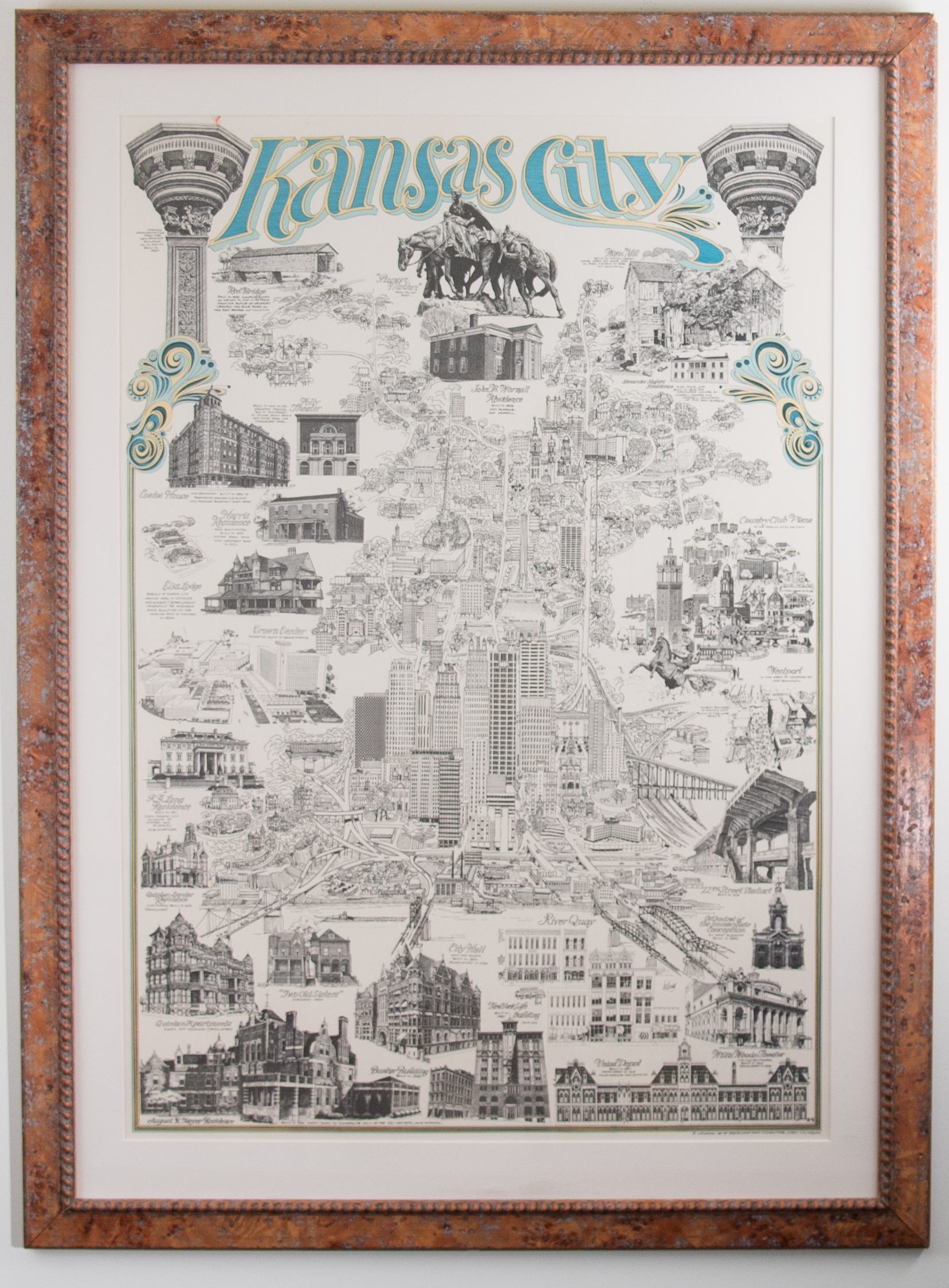 Below the blue and yellow printed "Kansas City" across the top of this piece is a synopsis of the city's most notable architectural monuments by 1981. Some are still standing and some have since been demolished, but altogether they compile a history of the city with major monuments enlarged along the border of the print and smaller notations nearer the center. At the center is a pen and ink artist's representation of the city's north-south axis that is flattened with the major monuments branching off of it. The Pioneer Mother monument crowns the composition and goes clockwise to include the Country Club Plaza, New York Life Building and Crown Center, with a multitude of architectural sites and districts in between. Two depictions of the corner ornamentation from the New England Building at 112 W. 9th Street flank the city's name at the top and connect to the mirroring ornamental appliques that begin a thin color border around the lower portion of the print.