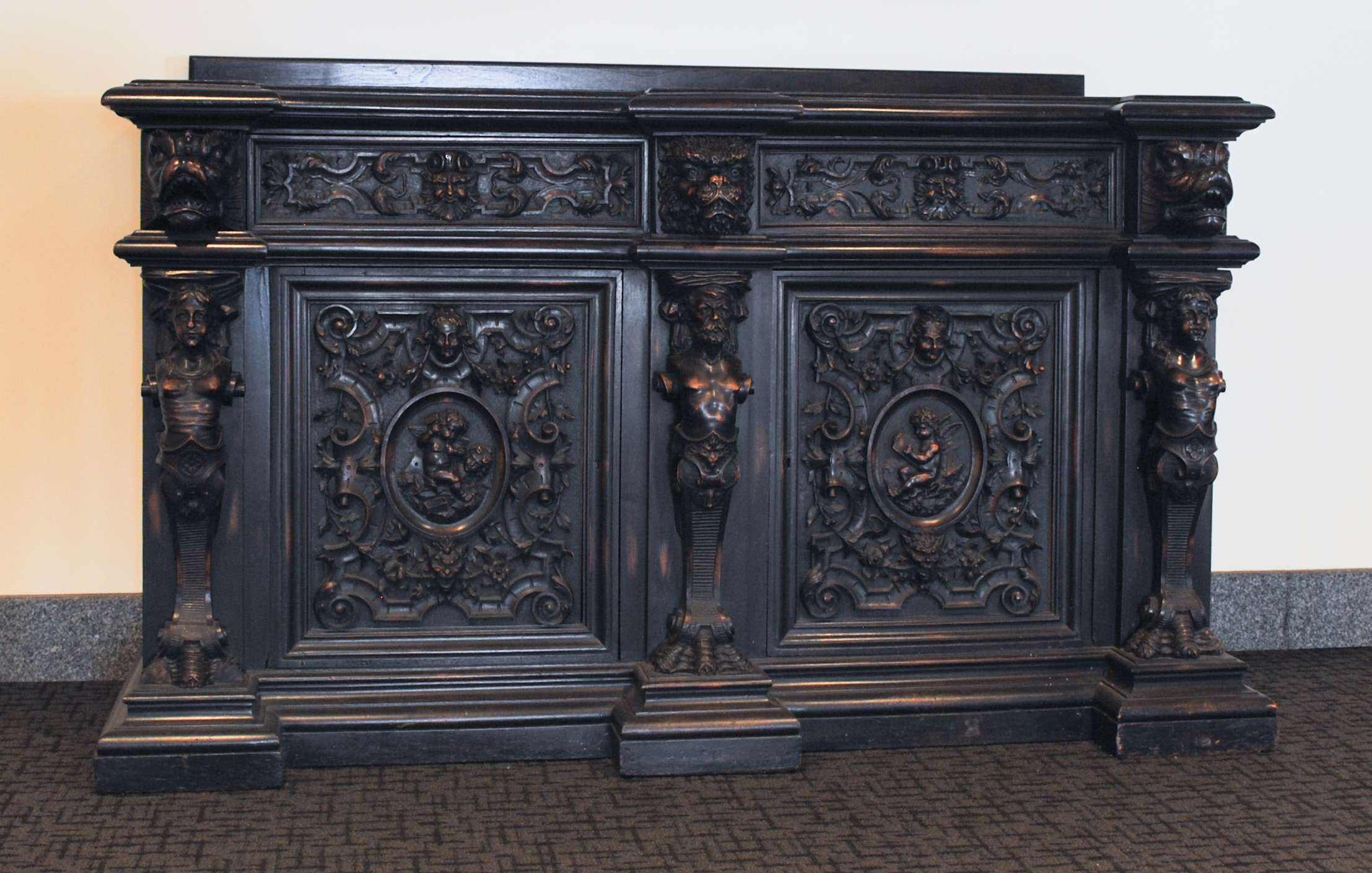 The massive Baroque style sideboard is adorned with ornamental flourishes and whimsical creatures on the front side. The finish is dark in color and shines with an almost bronze quality. The sideboard contains two drawers and two cabinets separated by three columnal outcroppings. Across the front of the cabinet are a number of grotteschi: two cherubs, one shown participating in the arts and the other in literature; masculine, angelic, and monstrous faces; three figures, one masculine on the middle column flanked by two feminine figures on the outer columns and the heads of three creatures that appear to be dragons or oceanic serpent creatures. For being an auxiliary piece of furniture, this sideboard is remarkable in terms of weight and ornament.