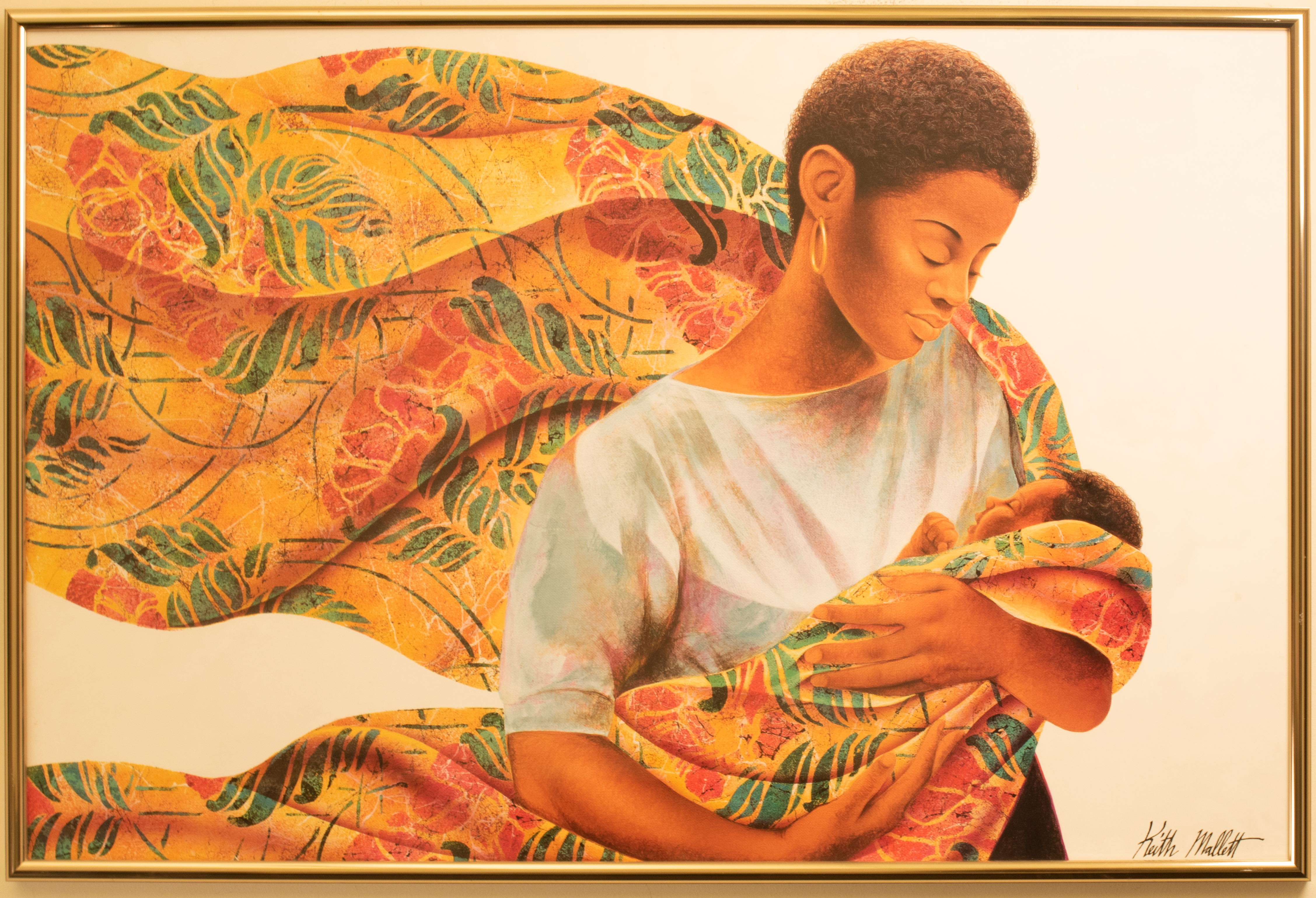 Keith Mallett, born on 7 October 1948, is an American multi-disciplined artist. Mallett's is an experienced painter, etcher and ceramic artist. Mallett's subject matter ranges from figurative to still life and abstracts. "Beloved" has all the hallmarks of Mallett's figurative work. Here a mother cradles a child to her bosom, as she gazes down lovingly on her infant. The child is swaddled in a brightly colored floral print, with predominant colors of red, green, orange and yellow. The white background accentuates and defines the figures in the foreground. The work bears the artist signature in the lower right corner.