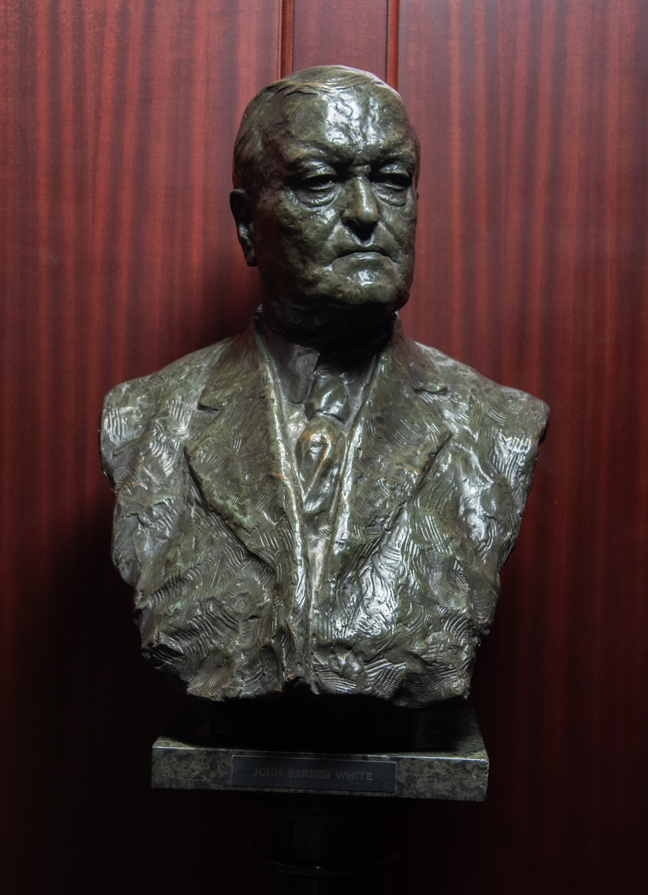 This bronze bust depicts the lumber baron, John Barber White, and rests atop a green marble pedestal. John Barber White, researched and published his family genealogy and spent years collecting the finest books on genealogy and American history. In 1933, ten years after White's death, his descendants donated this collection to the Kansas City Public Library. This donation greatly enhanced the Missouri Valley Room's genealogical collection. Donated along with the volumes from his genealogical library was this bronze bust of White.