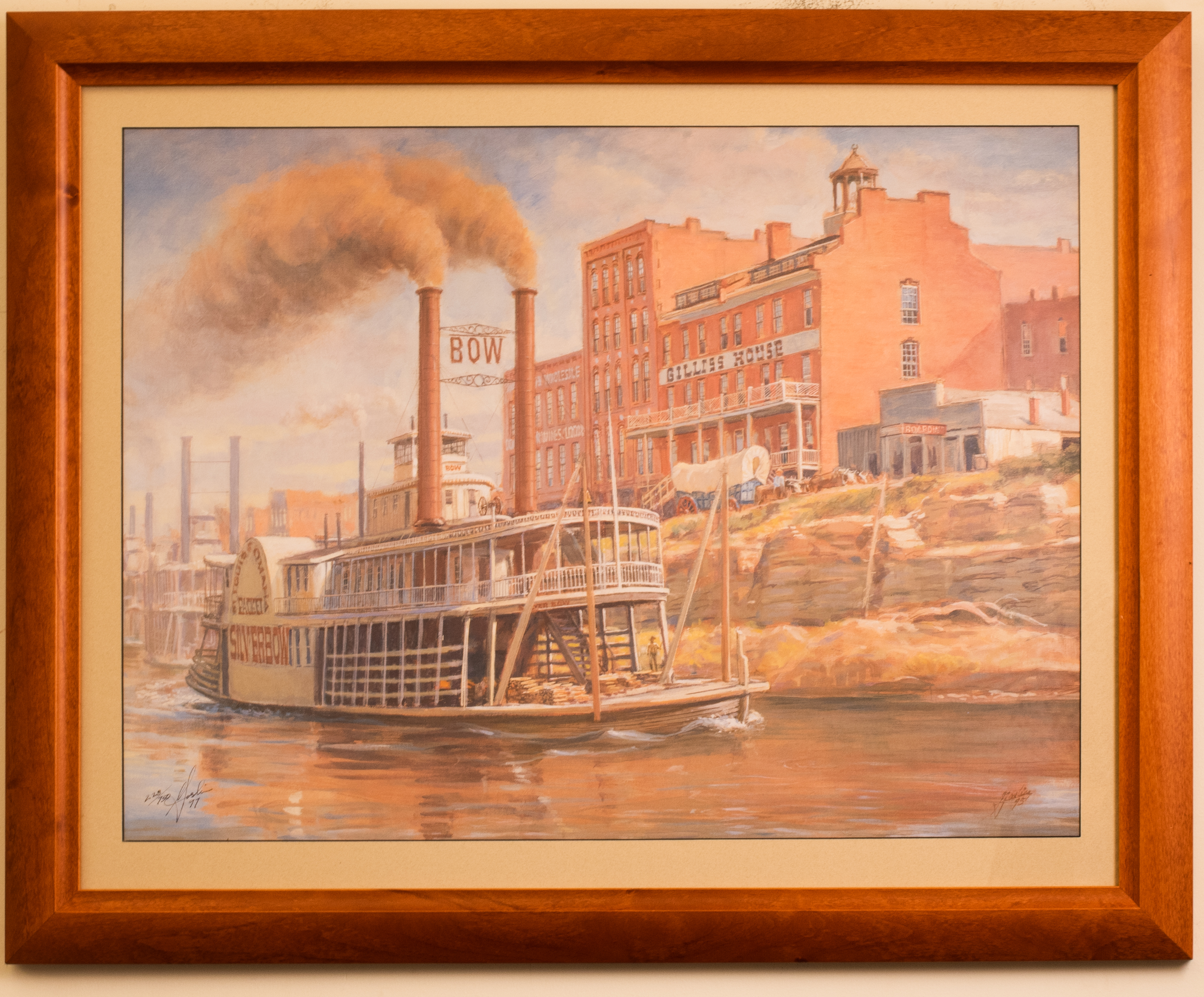 This print depicts a painting by Missouri-born artist Charles Goslin created in 1997. The piece features the steamboat Silverbow gliding past the Gilliss House and a wine and liquor store to its right. A covered wagon and oxen bridge the top of the bank, setting this picture along with the steamboat around 1855. Steam billows up from the stacks of the Silverbow and trail back down the direction of the river on which more steamboats are floating in the background. The painterly strokes with which the artist depicted the unfinished banks suggests a roughness about the scene that he attempted to capture. Goslin contrasted the roughness with sparkling innovation such as the steamboat. The steamboat itself shows a complete image of progression experienced by mid 19th century Kansas City.
