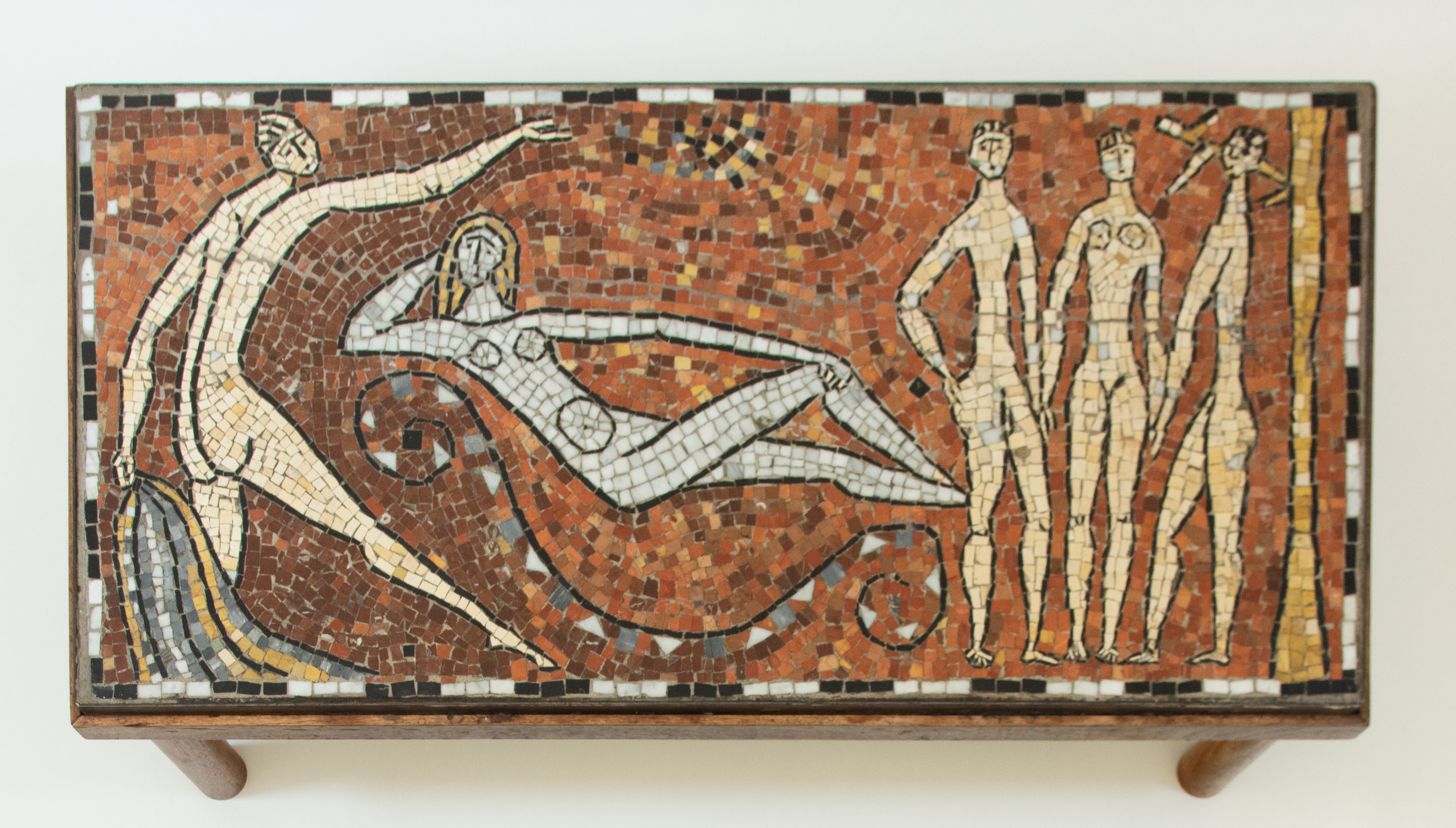 Gabriella Polony Mountain's work includes four major themes. The first three themes are clearly recognizable as the Cosmos, Nature, and Figural works with the fourth theme encompassing history, philosophy, and culture. In her life as an artist, Polony Mountain worked with many different medium including mosaics, weavings, sculpture, stained glass, and repousse. A mosaic is a pattern or image made from small irregular shaped pieces of colored stone, glass, or ceramic called tesserae (individual tiles). These tesserae are held in place by plaster or mortor. Mosaics can typically be found on walls and floors. Gabriella Polony Mountain breaks this traditional form by creating a mosaic table.