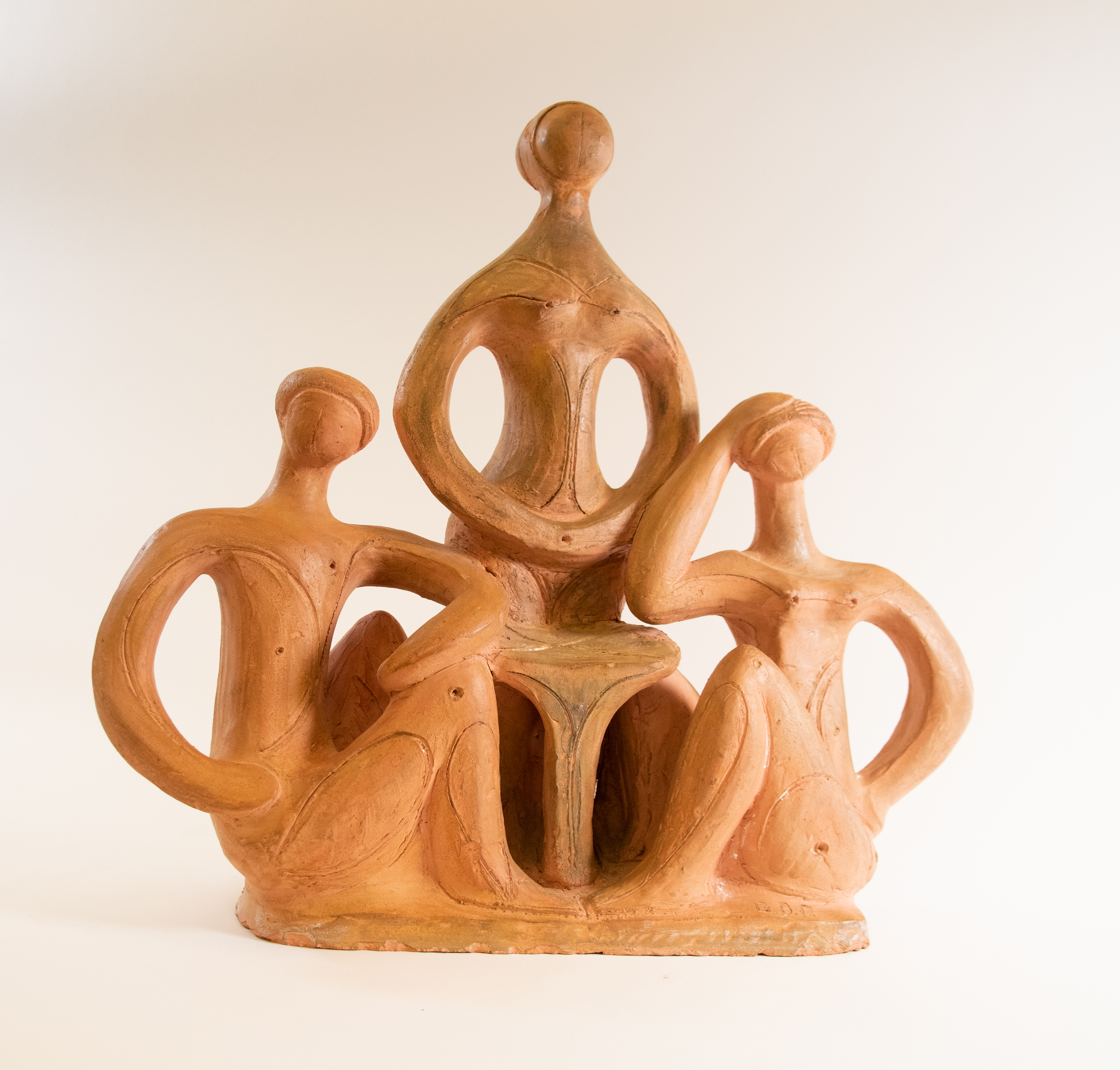 One material that Polony Mountain used to create sculptures is terracotta. Terracotta is a clay based earthenware that be can glazed to give a sheen to the final piece, or left unglazed in its natural porous form. In "Conversation Around the Table," two seated figures and one standing figure are arranged around a small table. Large circular forms and carved curvilinear lines are used to accentuate and define the figures and the table. While the facial features are left blank, the figures can be identified as one man and two women.