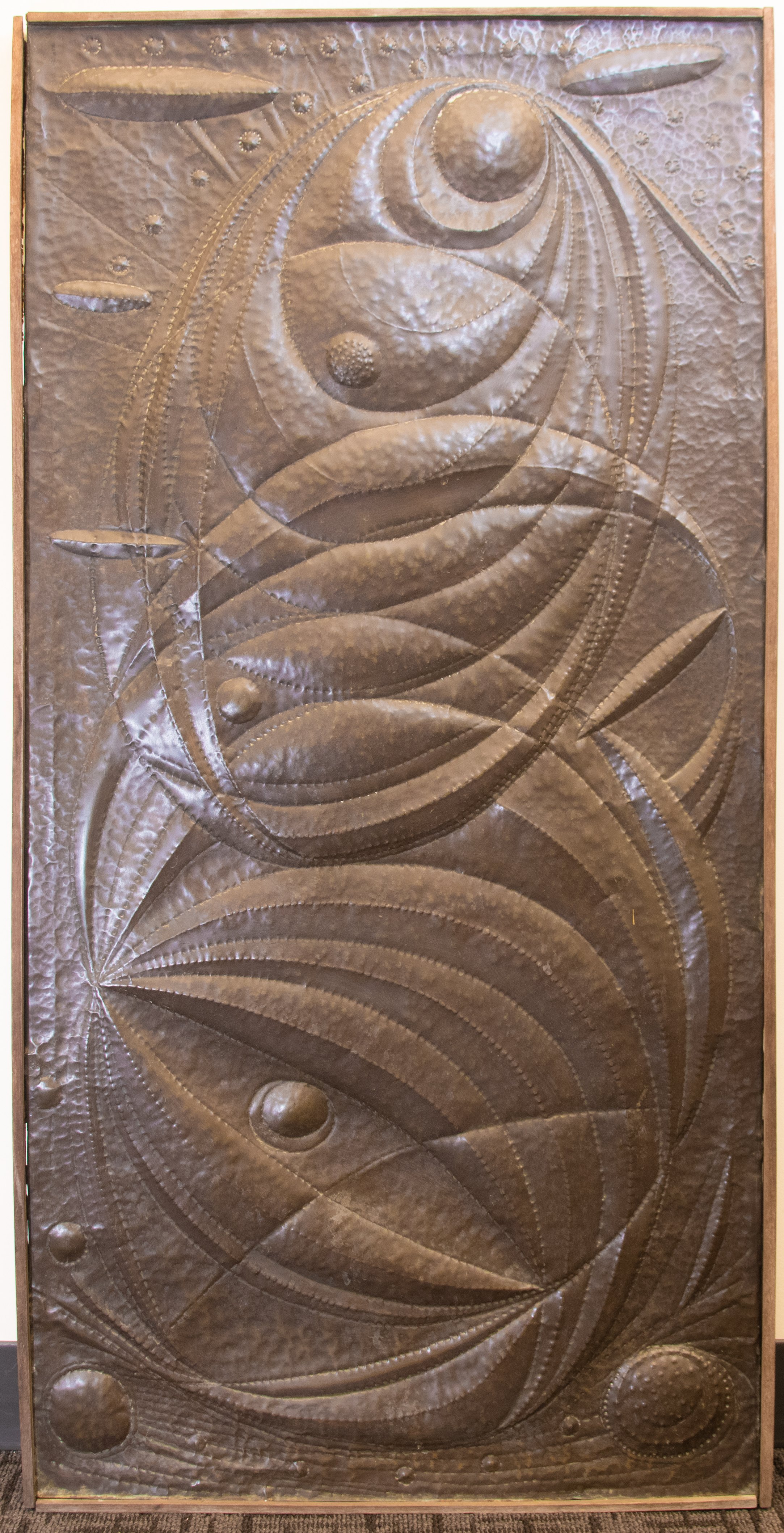 This screen is but one example of Polony Mountain's skill with the repousse technique and her ability to create movement within an otherwise static material.