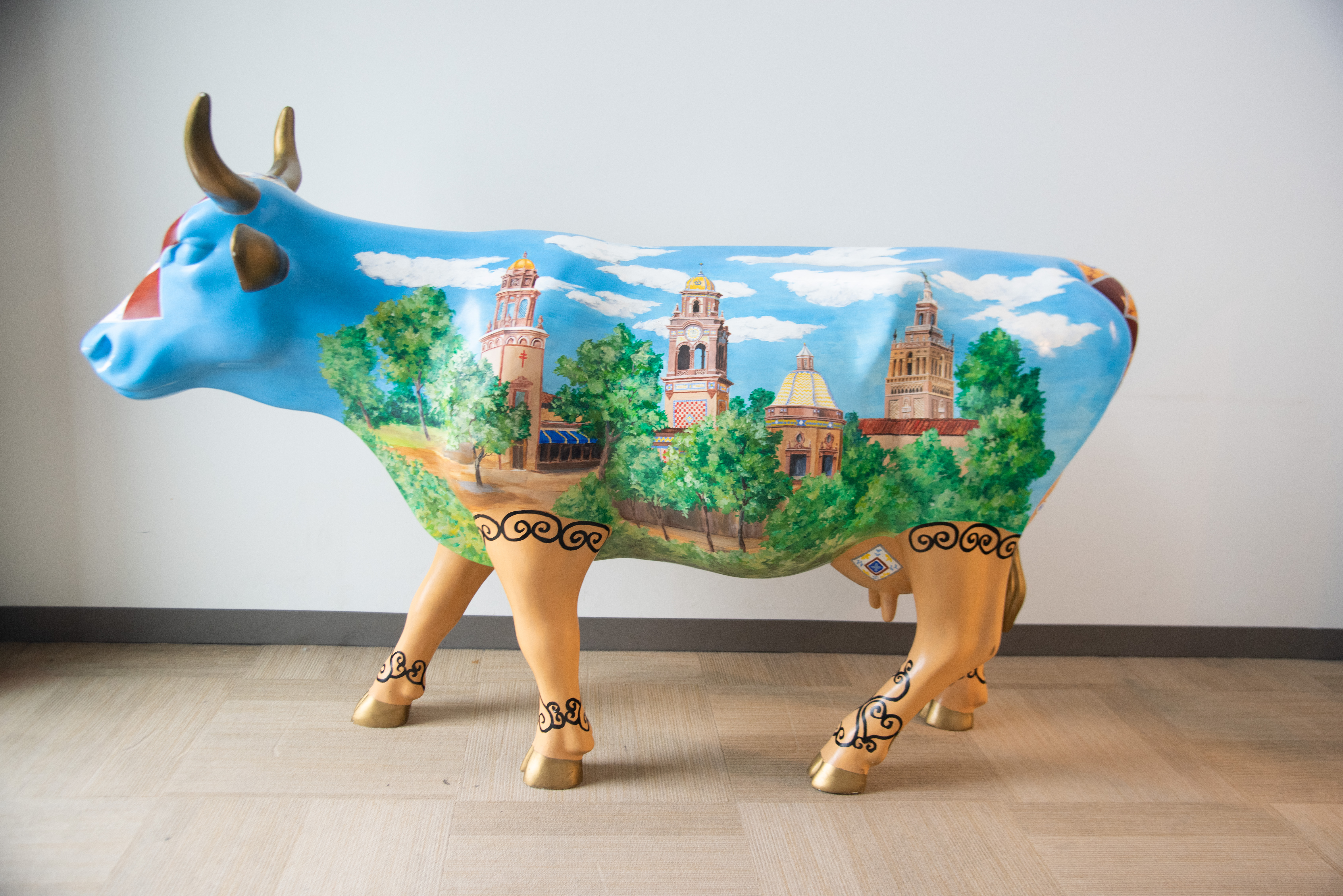 Artist Carol Hensley painted both sides of CowTown Plaza in a bucolic muralist style with images of iconic architecture found across the Kansas City Country Club Plaza. Placid cumulus clouds punctuate a bright blue sky and an abundance of lush green trees line the promenades. The cow’s horns, ears, hooves, and tip of the tail were all painted antique gold. She embellished the head, tail, and udder with vibrant depictions of terracotta, blue, yellow, and white Spanish tiles incorporated into many architectural details seen around the Plaza. The cow’s legs were painted to represent traditional exterior Spanish stucco walls, which Hensley chose to contrast with black swirls reminiscent of graceful wrought iron balconies. These design elements all serve to remind viewers that Kansas City is a sister city of Seville, Spain.