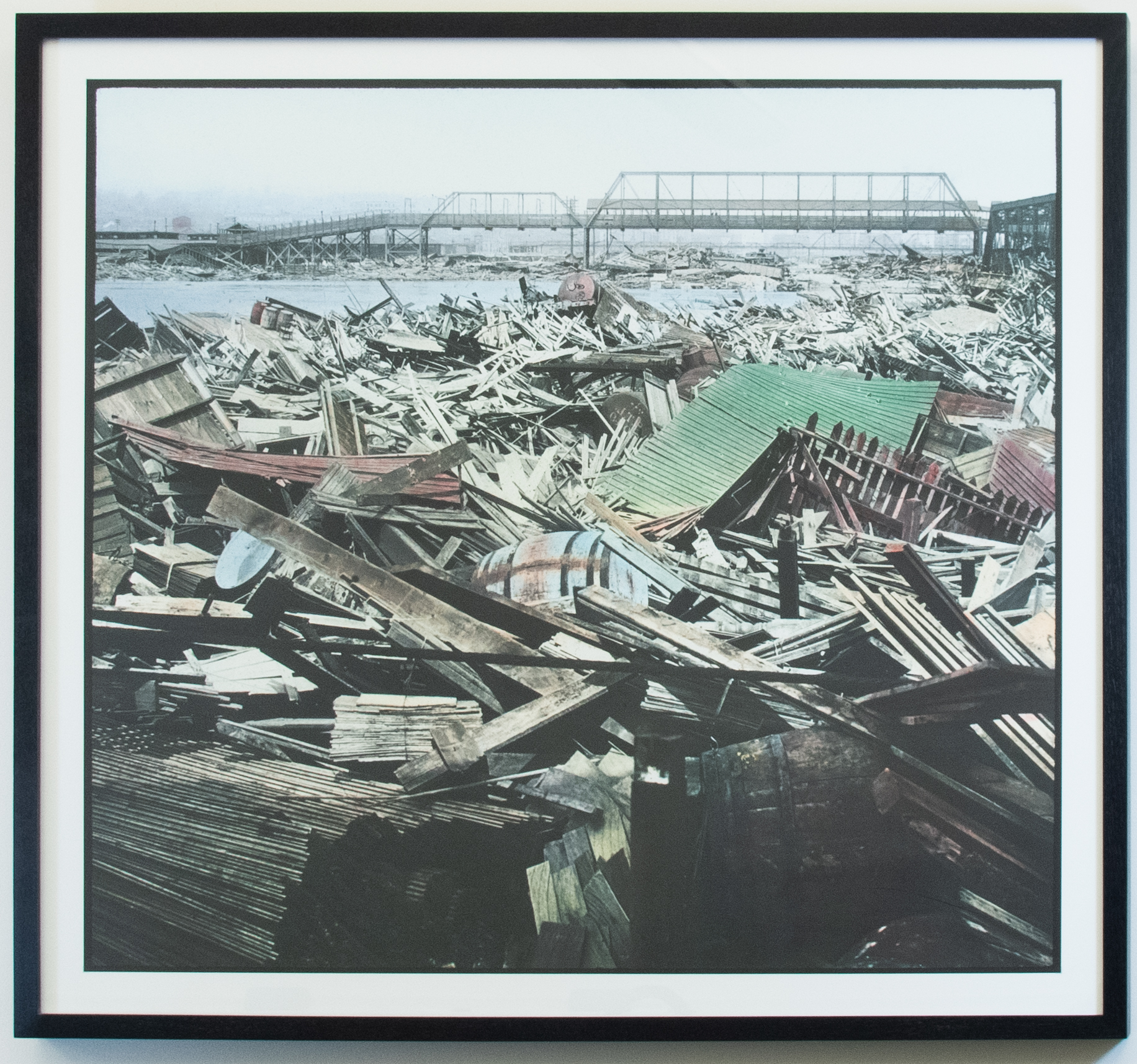 This image documents the immensity of debris left by the Great Flood of 1951. The vantage point appears to come from a western area looking eastward toward the West Bottoms as the original John Deere building located at 13th and Hickory Street can vaguely be seen in the distance. Taking up roughly three-quarters of the image foreground is a mess of barrels, wood, and sections of fencing and roofing. Aside from the bridge and the river itself, there appears to be no end to the expanse to the mass of debris in the photograph. This photograph was originally black and white and color touched afterward with red, green, and blue to give some depth to the debris in the foreground. The Great Flood of 1951 is also referred to as the "1 Billion Dollar Flood" for its total amount in damages.