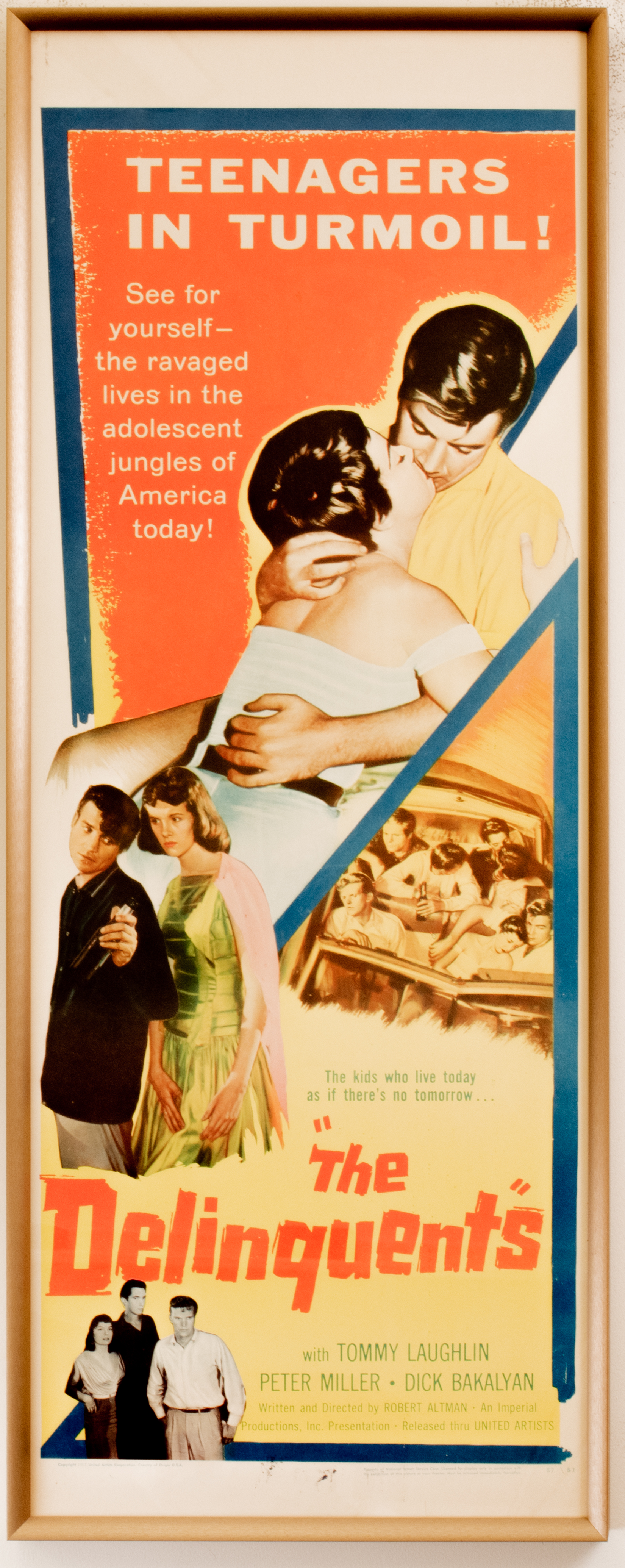"The Delinquents", a 1957 American dramatic cinematic film was written and produced by Robert Altman. The plot of this film follows two romantically involved teens, Scotty White and Janice Wilson through Kansas City amidst an era of hot rod gangs and youthful delinquency in the 1950's. The poster is noted for its high utilization of color saturation. Vibrant red is laid out in a triangular shape on the upper left corner of the poster. The lower right corner contains a concentrated yellow and each area is bordered by a solid blue. In the center, two figures are entwined in a romantic embrace. The main characters Scotty White (Tom Laughlin) shares a passionate kiss with an unidentified young woman. Directly below them, seven youths are depicted piled into a car. To their left the Eddy (Richard Bakalyan) appears to be in conversation with Janice (Rosemary Howard). Below them three additional characters displayed from the movie, a young woman, the character Bill Cholly (Peter Miller) and the character Scotty White.