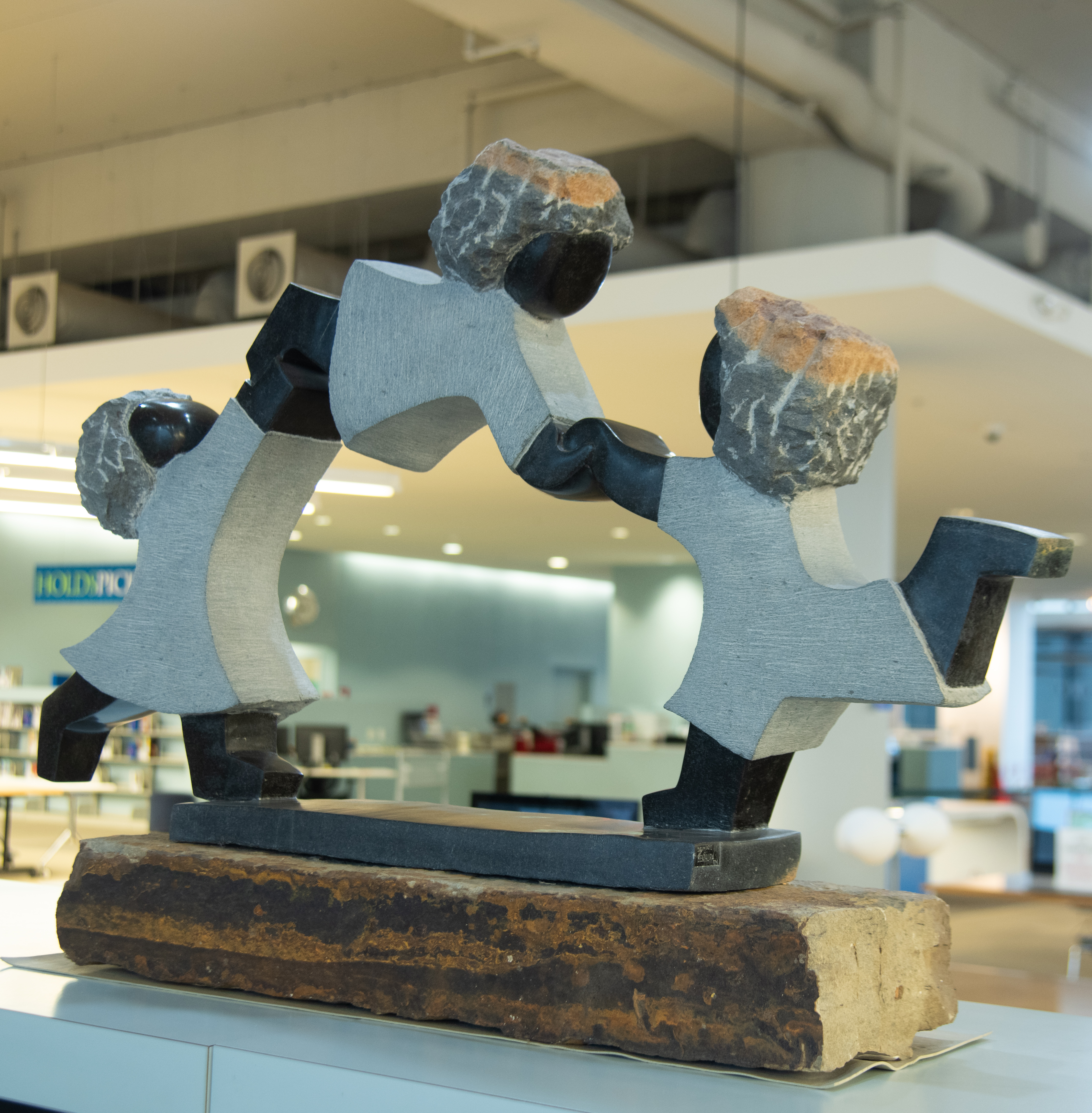 This sculpture titled Don’t Drop Me by Dominic Benhura depicts a group of three children engaged in lively interaction. In designing this playful paragon of joy, Benhura combined steel, wire, and stone to compose a work of art that practically sings out loud.