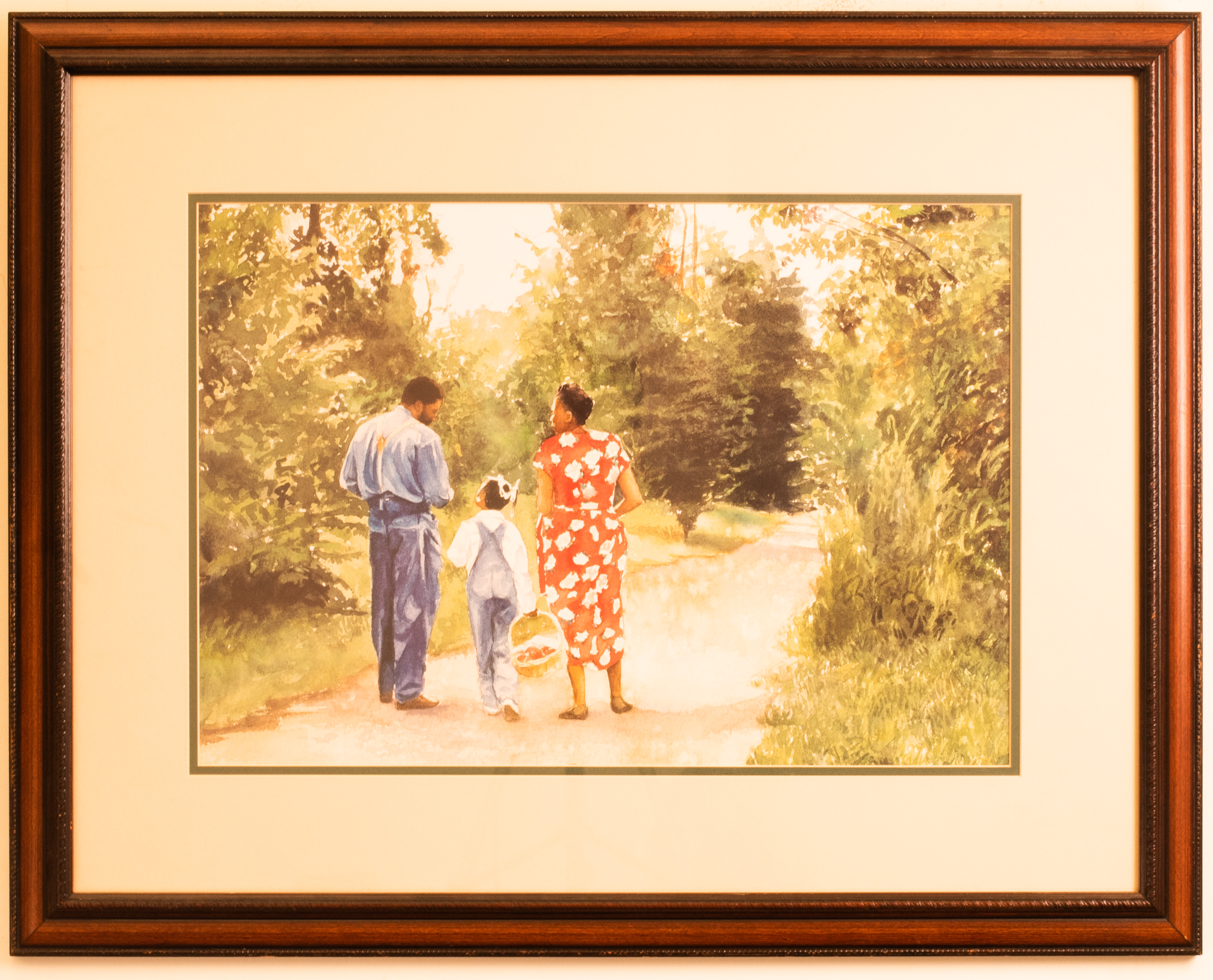 Earl B. Lewis is an artist and award-winning illustrator who has illustrated over 50 children's books. He works primarily in watercolor depicting stories about the lives of young black children and their struggle in race encounters, children in hospitals, and families. In this painting a mother, father, and child walk down an unpaved road visiting with one another. The father wears all denim with suspenders while the mother wears a long floral dress, completing a traditional image of a working-class family. The child wears a pair of denim overalls and holds a basket of apples. One can presume the family went to pick the fruit together in the countryside and are on their way home. Lewis' command of watercolor achieves great depth in the painting in the layers of green that comprise the surrounding woods while simple white spaces left untouched attribute realistic highlights to the scene.