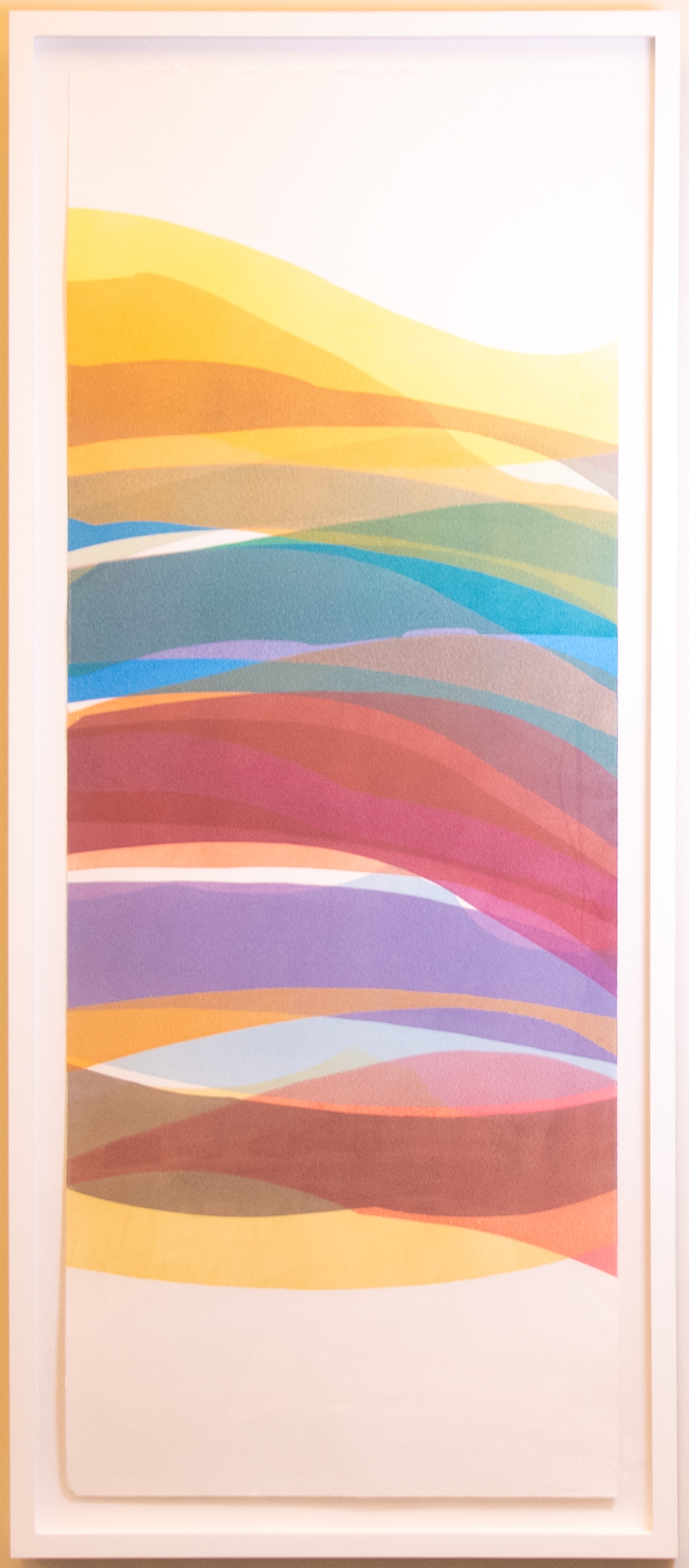In Berman’s mind, information and knowledge flow like an unseen current between people and media in the library environment. This print is one of ten that visualizes this phenomenon in the ebb and flow of color across them. While the series has a cohesive visual effect when displayed together, each individual unit has its own unique characteristics. In the third of the series, vibrant blue, yellow , and red colors are mitigated by subsequent neutral layers trend in a downward motion toward the next piece. Within each frame, the layering of color creates new shapes and hues that add to the overall flow of the work. One can imagine the layers of color to be like layers of information in the mind, crossing to create new colors and new ideas.