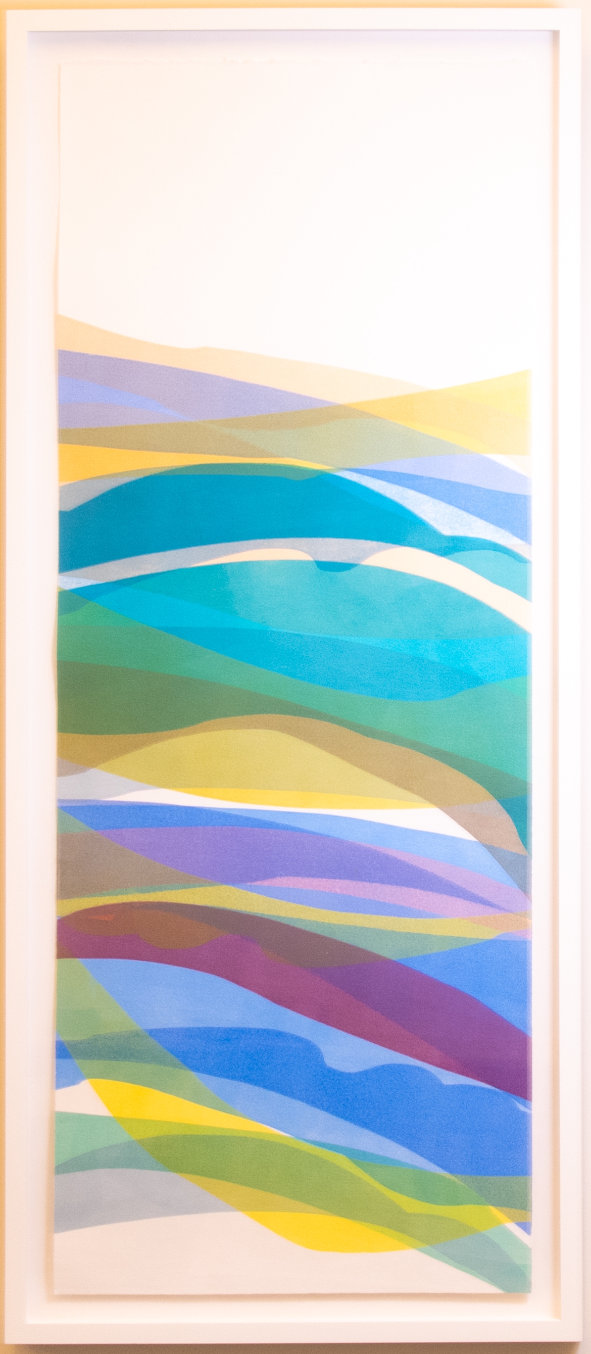 In Berman’s mind, information and knowledge flow like an unseen current between people and media in the library environment. This print is one of ten that visualizes this phenomenon in the ebb and flow of color across them. While the series has a cohesive visual effect when displayed together, each individual unit has its own unique characteristics. In the seventh of the series, the color current appears to bow upward and is dominated by vibrant blues with a few streaks of yellow. Within each frame, the layering of color creates new shapes and hues that add to the overall flow of the work. One can imagine the layers of color to be like layers of information in the mind, crossing to create new colors and new ideas.