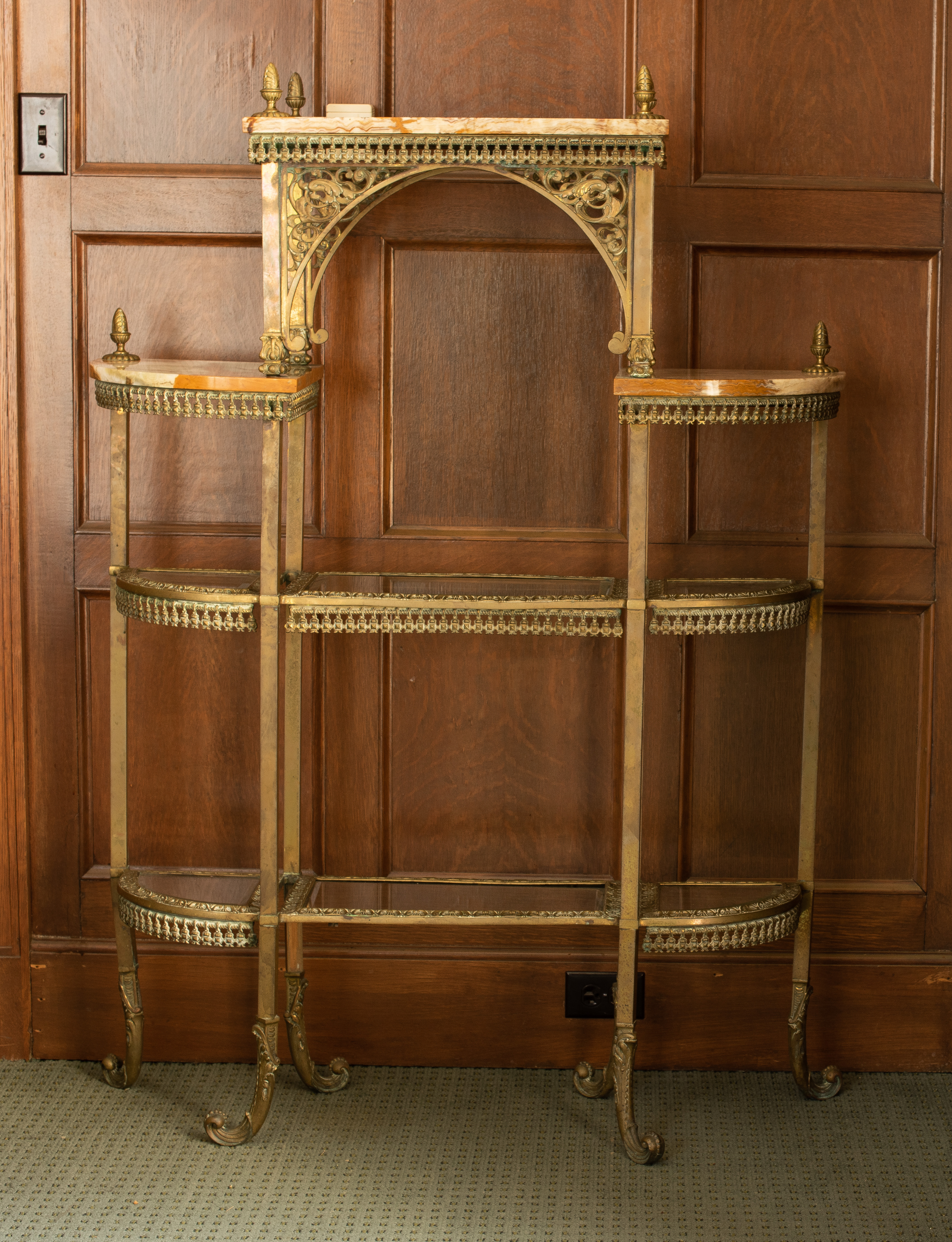 While the date for this particular etagere is unknown, it is a very nice example of an etagere. Etageres would have been used to hold and display ornaments and bric-a-brac for show. This particular piece is a four tiered etagere made of brass, glass, and orange marble. The top two tiers have orange marble display shelves while the two lower tiers are made of six beveled glass pieces with three pieces of glass to each shelf. Acting as the body of the etagere, ornate floral and tassel brass elements juxtapose functional brass structural elements. The feet of the etagere are adorned by leaves which curl up ever so slightly. Placed atop the orange marble shelves at each corner are acorn-esque finials.