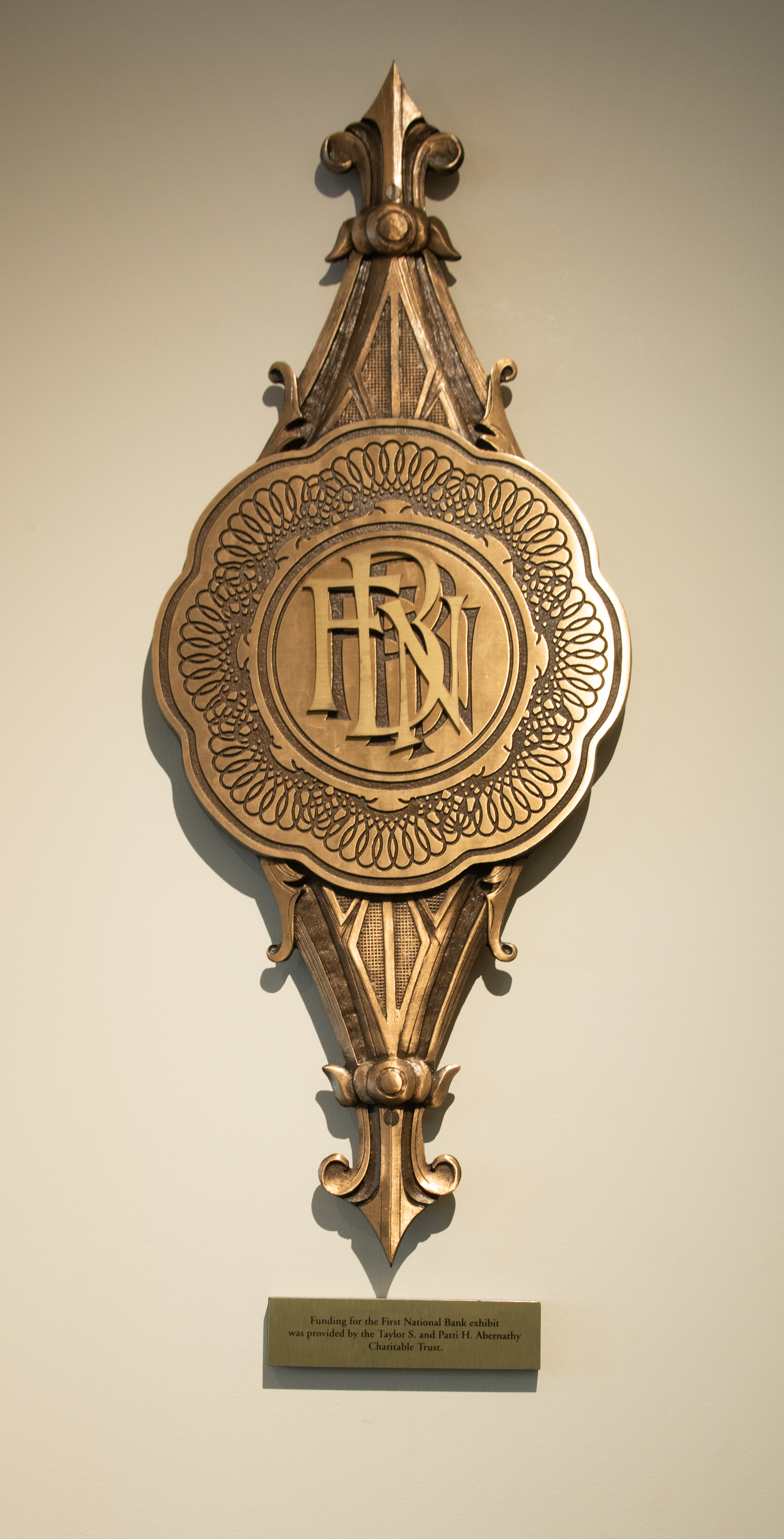This pennant commemorates the First National Bank of Kansas City. Established in 1886 by Col. James Abernathy and James Lombard, the First National Bank was eventually housed in the building now utilized by the Kansas City Public Library's Central Branch. The Library pays homage to much of the Bank's original features and has dedicated a section of the first floor to the First National Bank Exhibition near One North. To the right of that exhibition is this bronze pennant, dedicated along with the exhibition by the Taylor S. and Patti H. Abernathy Charitable Trust. The pennant centers the First National Bank acronym, FNB, in a medallion with an inscription pattern stylized in the likes of a seal on United States currency. The acronym itself exists on two planes with a raised set overlaying a recessed set that creates the illusion of exaggerated dimensionality. Protrusions from the top and bottom of the seal add to its regality with a highly ornamented design. Spades with mesh relief graduate in either direction to spears flanked by layering scrolls on each side. The unification of rounded elements with sharp ones completes an air of elegance and power finalized in the material of the pennant itself. Altogether, the design and material of the pennant not only the First National Bank but its wealth and establishment as a pioneering institution in the city.