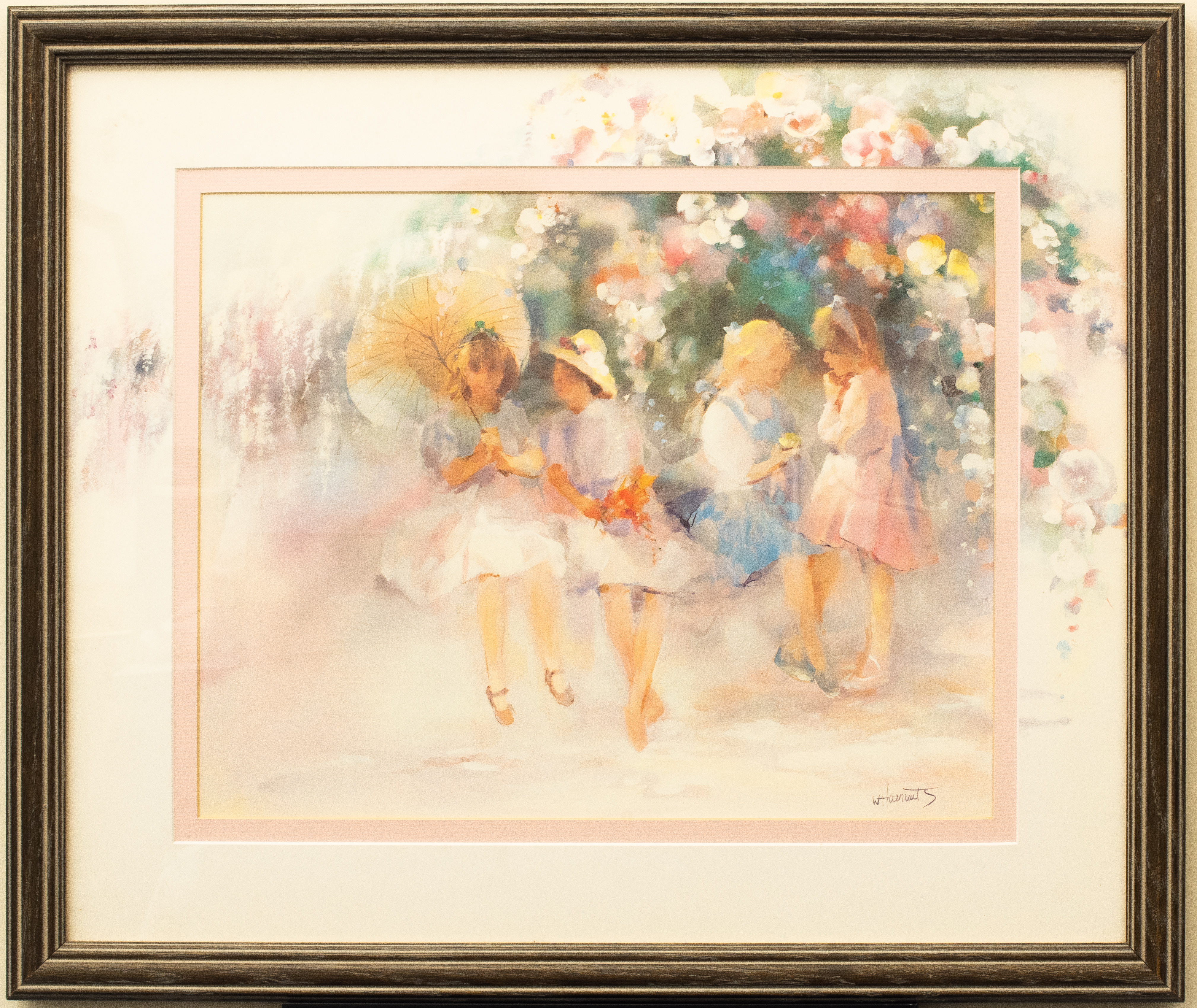 This work features four young girls seated against flowered foliage. They break into pairs and appear to examine flowers picked from the shrubbery. This work was painted in an impressionist style of painting. Where the details are substituted for swatches of color that convey the light and emotion of this warm and whimsical day. Pastel colors dissipate into white, seemingly framing the scene in bright sunlight. The colors extend onto the outermost layer of matting with a solid light pink layer of matting separating them. The original painting was by impressionist painter Willem Haenraets. As early as the age of 16, Haenraets studied at the Academy of Arts in Maastricht, the Netherlands, and furthered his education at the National Institute of Fine Arts in Antwerp.