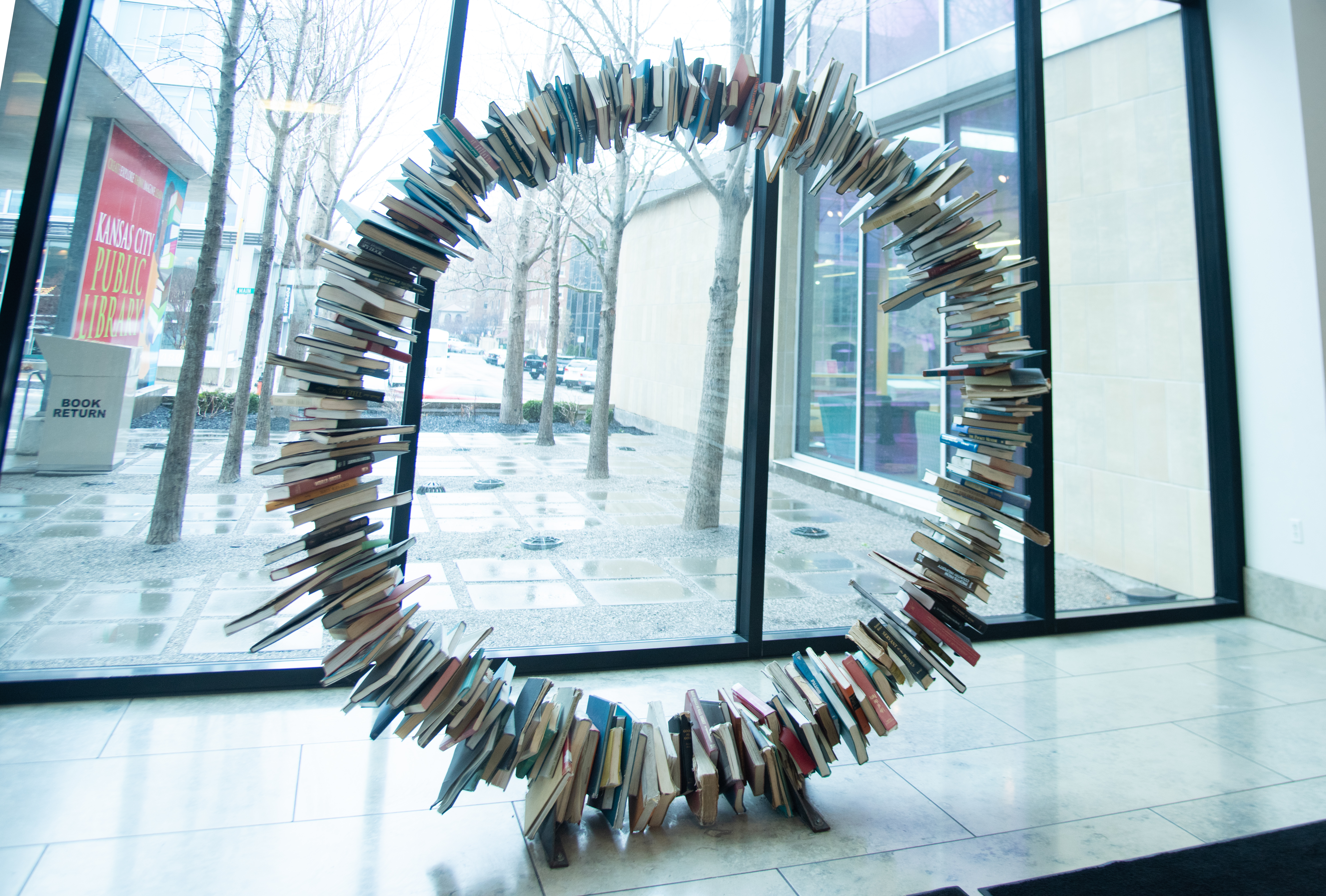 Viewers of Good as Gold by Donald Lipski might consider the abstrusity of books drilled with holes placed on an eight foot tall round steel form. Upon further observation however, the commanding work might be interpreted as a literal representation of the portal through which readers travel to alternate worlds via books. Most of the books included in the work were sourced from a Bridgehampton, New York Book Barn, but Lipski incorporated withdrawn items from The Kansas City Public Library’s collection as well. Each book was selected based on size, color, and subject matter. Lipski attributes the title to author Joseph Heller’s novel “Good as Gold”.