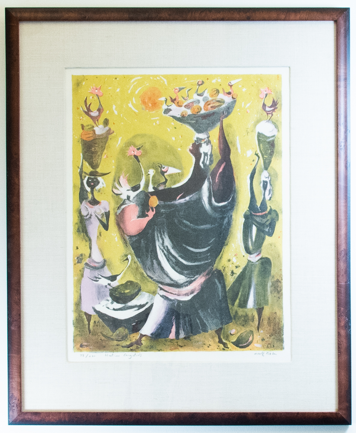 The canephora as a symbol of strength and prosperity is recontextualized in this lithograph for village life in Haiti. Instead of elaborate hairstyles to reinforce this symbolism, each figure extends one arm to support the basket overhead, which also emphasizes the arm as the tool used to gather. The composition conveys the atmosphere of this moment through the acknowledgment of the sun. The central figure and many birds look upward toward the sun and are met with its radiance represented by subtracted color in the print. In doing so, their postures appear to exalt their bounties as well which creates cohesion between the figures and their environment. The print utilizes a limited pallet that prioritizes the fluidity of line and shape in the composition.