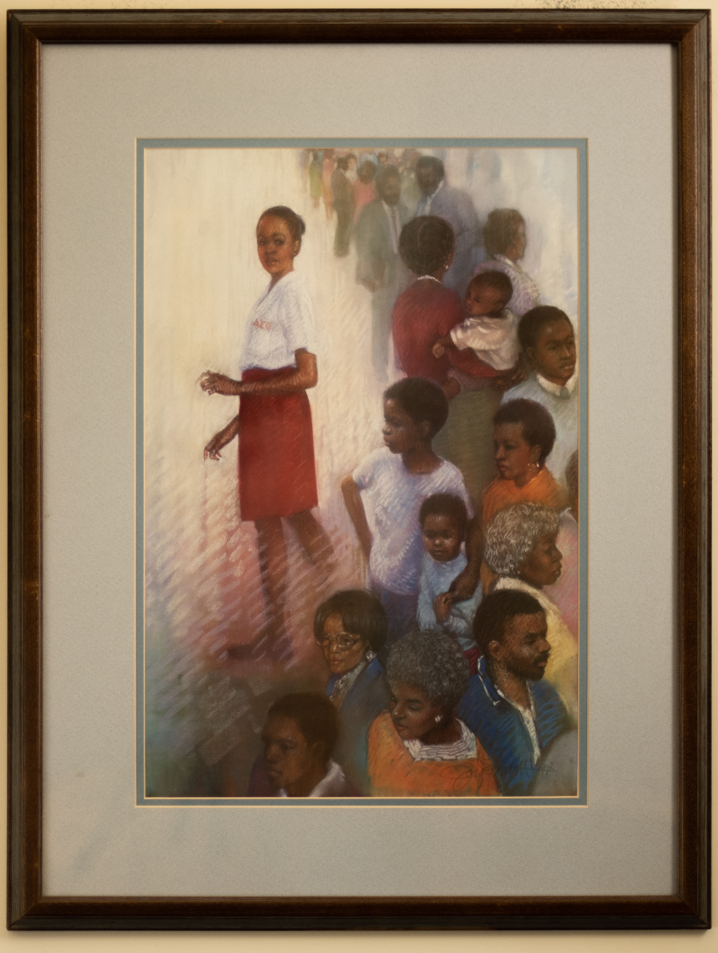 This print features a young Black girl seen wearing a sorority blouse and red pencil skirt. A line of presumed family and friends extends from detail in the foreground into the haze of the background. Although in close proximity to one another, each figure appears to stand alone, collaged into the young girl's memory of those who have influenced her in life. As she steps forward, breaking away from her system of influence, she looks back and considers their impact as she advances on her next journey. Realistic detail merges with the natural haze of the original medium and other prominent marks made to create a thoughtful, dreamy essence about this piece. Joysmith's works convey narratives about the Black experience and begin with a realistic depiction of the subject followed by impressionistic elements and vibrant colors to guide the interpretation of the work, as can be observed here.