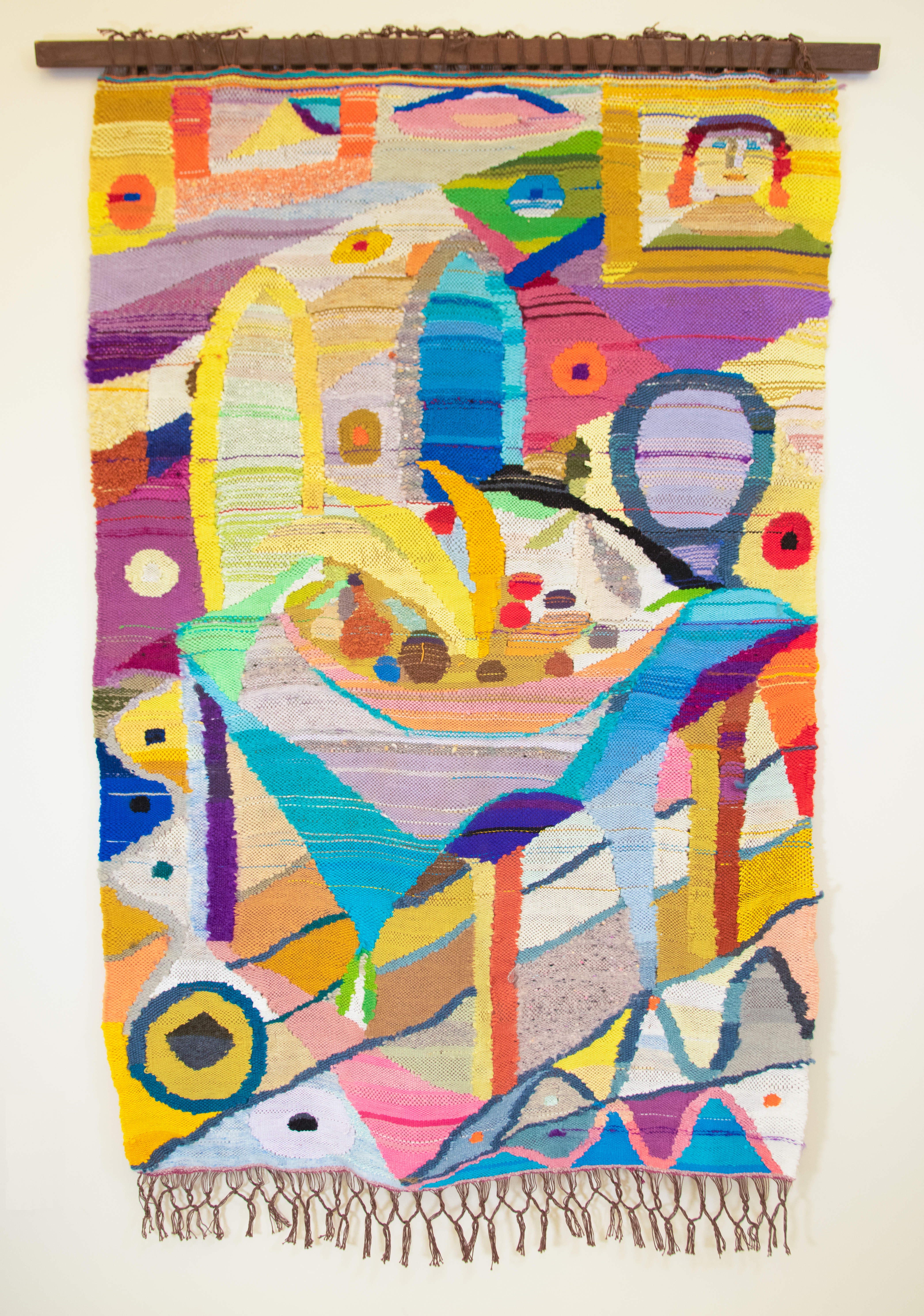 In "Interior with Still Life," Polony-Mountain places the viewers attention on the table at the center of the composition. A bowl of fruit and small jars adorn the tabletop and the image of a pyramid and portrait hang in the background. Her use of pastels juxtaposed to neon hues creates a dynamic play with the various shapes in the work. One interesting element of Polony-Mountain's weavings is visible with a closer glance. She appears to have made many small weavings that she has hand sewn together to make one cohesive image.