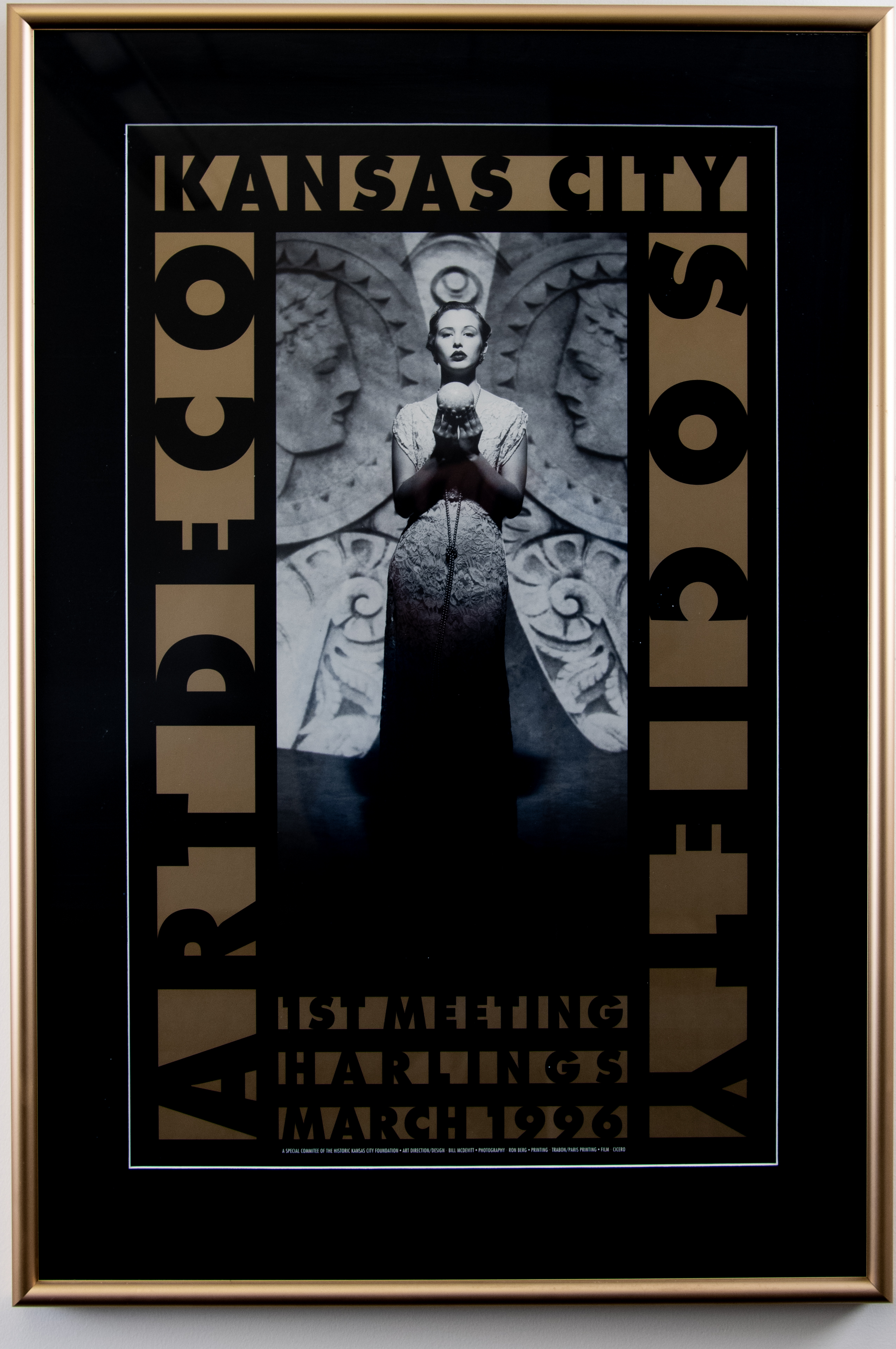 The Kansas City Art Deco Society was founded by Bill McDevitt in 1996. McDevitt's goal was to "preserve the bold geometric patterns and streamlined designs that comprised the area's signature architecture in the years between the World Wars" (-Kansas City Business Journal). This poster serves as a graphic token of those designs. A black san serif font overlays a gold border. At the center, a female figure stands in a presentation stance in front of a highly stylized Art Deco structure. This central image is most likely a still from a film. The included text reads "Kansas City Art Deco Society 1st Meeting Harlings March 1996."