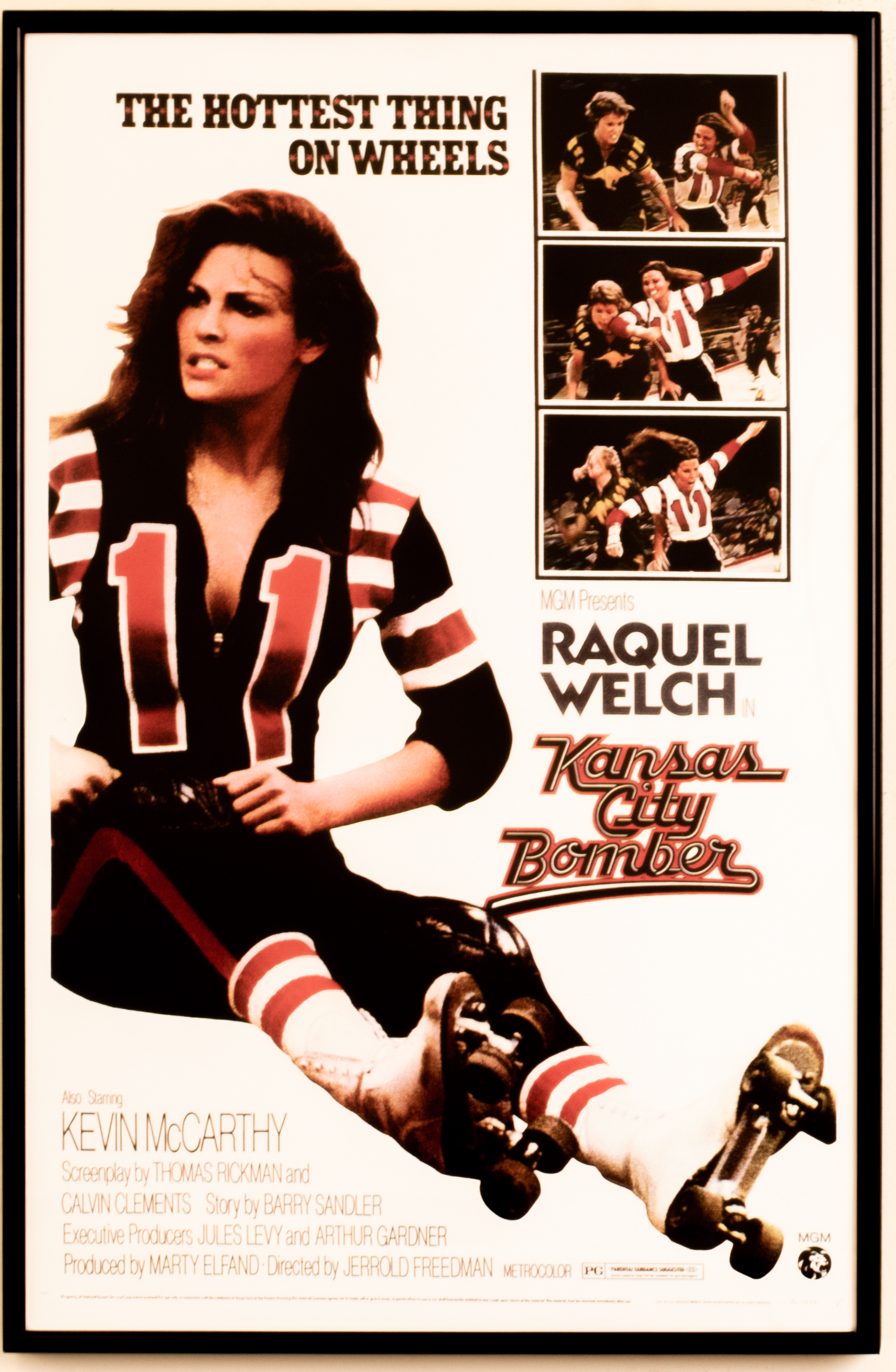This poster features a larger-than-life Raquel Welch in her role as K.C. Carr in the 1972 film "Kansas City Bomber". This film was a drama about the merciless social dynamics behind the scenes in the sport of Roller Derby. Raquel Welch, or K.C. Carr, plays a single mother and derby star who leaves her team in Kansas City to play for the Portland Loggers in Oregon. Work, romance, and deceit plague her experience with her new team until K.C. Carr realizes her fierce independence is the key to her success on and off the track. Along with real-life Roller Derby players, Welch performed many of the action scenes in the movie, practicing long hours during filming and suffering real injuries throughout. The poster features her seated and suited up with a fierce expression on her face. Next to her is a series of film stills that capture her speeding past another player and elbowing her in the face in the process. The ferociousness of the last shot explicates the headline at the top insinuating K.C. as "The Hottest Thing on Wheels". Credits to other actors and production members of the movie are printed in the bottom left-hand corner beneath Welch.