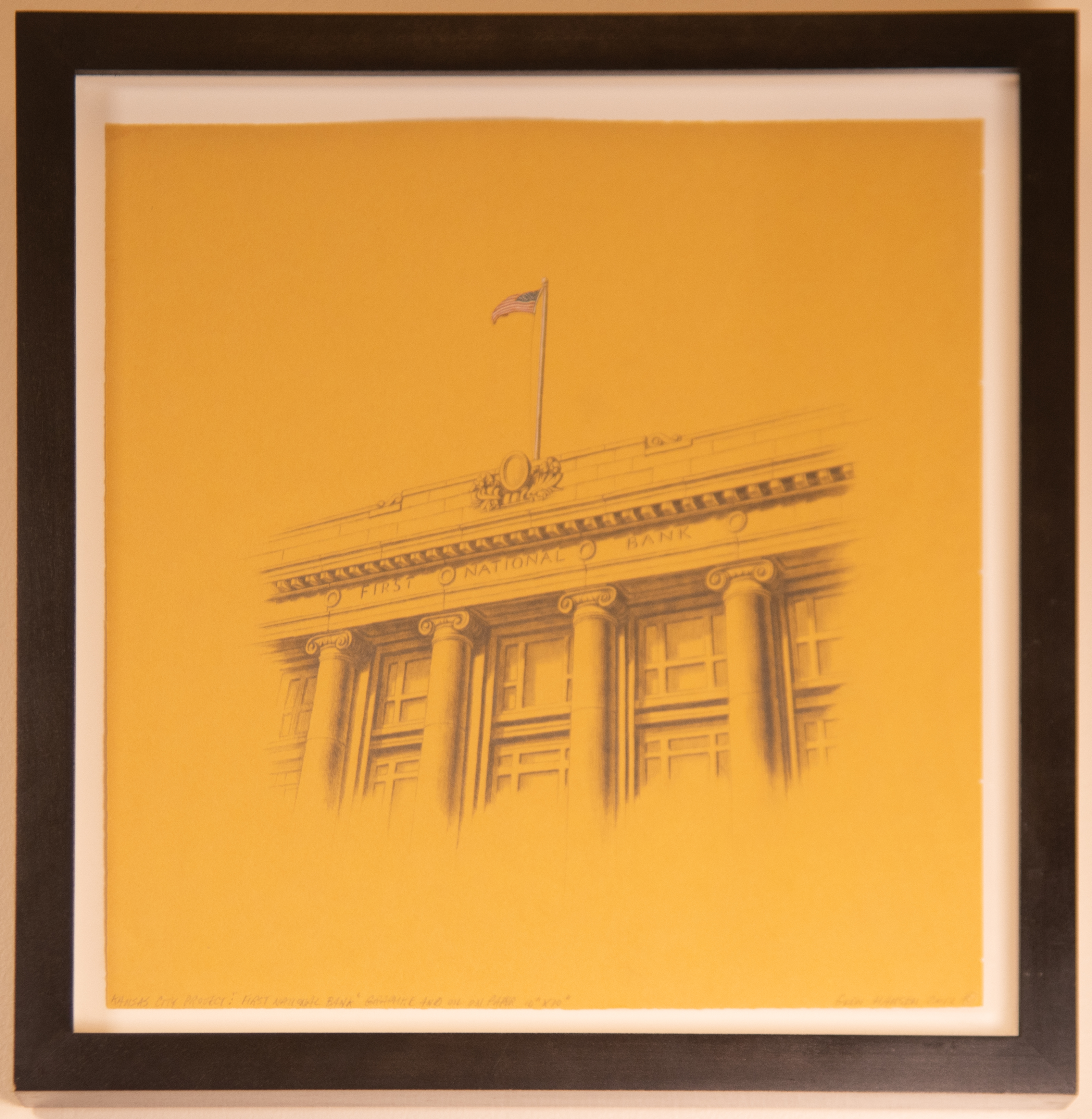 This drawing focuses on the architectural detail surrounding the building's title, First National Bank, which is engraved in stone. The building, now the Central Branch of the Kansas City Public Library, is known for its ionic order columns emphasized in this drawing. The columns support the entablature, which includes the architrave, the frieze, and the cornice. Most of the detail in the drawing fades with distance, but not the American flag mounted on the rooftop. The flag was rendered in red, white and blue oil paint, distinctly contrasting the yellow paper behind it emboldening the significance of the building. On the artist's website, Glen Hansen describes his process of isolating detail in a landscape to reflect his real interest and often gravitates toward architecture set against the sky. The work was included in the 2011 exhibition "Just in Time" at the Fischbach Gallery.