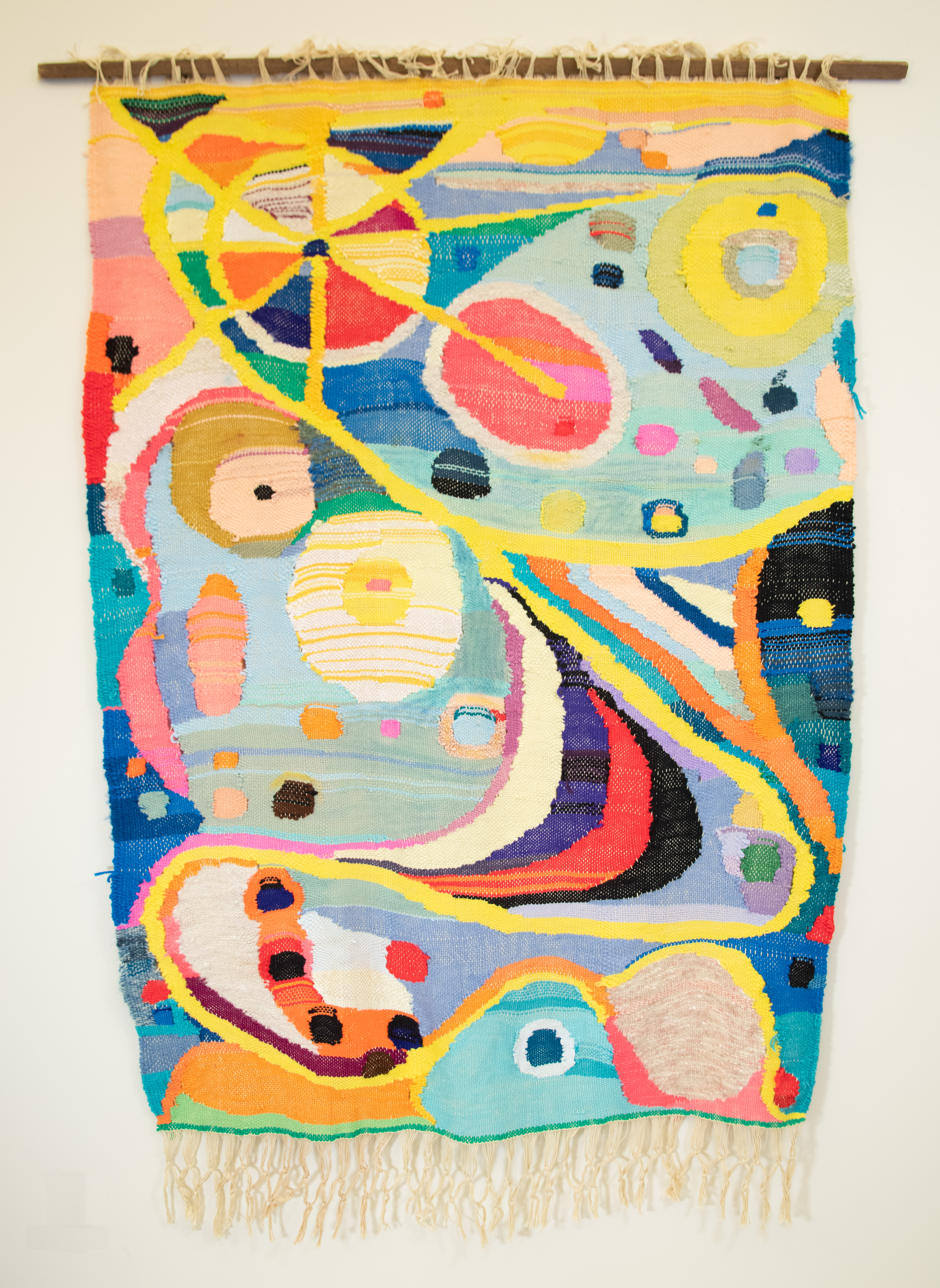 The "Milky Way" is a wonderful example of Polony Mountain's depiction of the cosmos. Using biomorphic forms, circles, and curvilinear lines to create an overall view of the cosmos. The biomorphic forms which included circles within circles of varying size allude to the cellular structure of things. A winding yellow path, beginning in the lower right corner of the weaving and moving its way upward to the top left, connects the many cosmic elements. Polony Mountain uses bright and vivid colors to portray her cosmos.