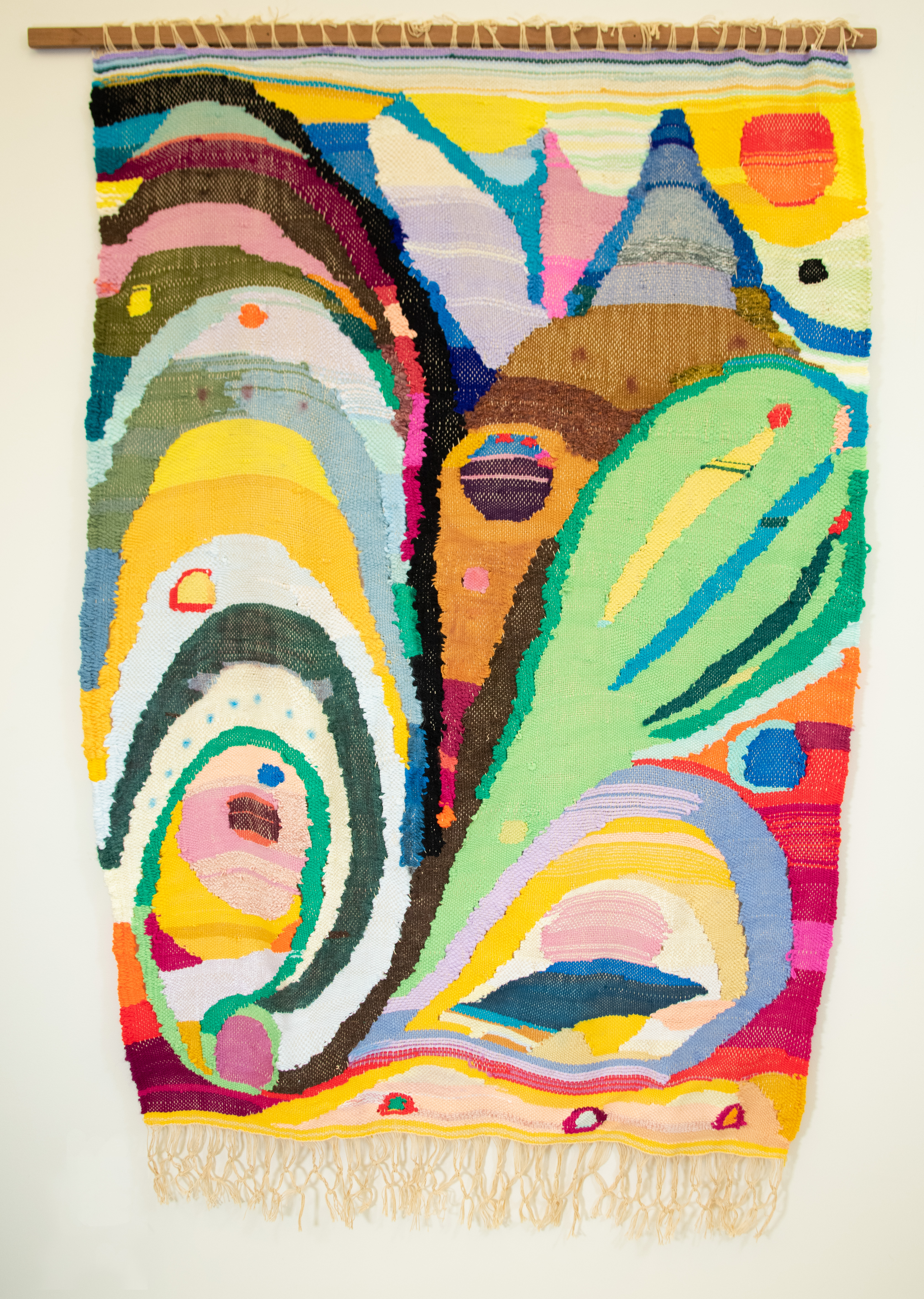 Gabriella Polony Mountain's work includes four major themes. The first three themes are clearly recognizable as the Cosmos, Nature, and Figural works with the fourth theme encompassing history, philosophy, and culture. In her life as an artist, Polony Mountain worked with many different medium including mosaics, weavings, sculpture, stained glass, and repousse. Weaving is a technique used to make textiles by interlacing thread. This technique can be accomplished with the use of an instrument called a loom, or by hand in various methods such as knitting, crocheting, felting, braiding, or plaiting. Polony-Mountain used a combination of loom and hand weaving techniques. And like her weaving techniques, Polony-Mountain used a combination of acrylic, cotton, and wool yarns to create her vibrant textiles.