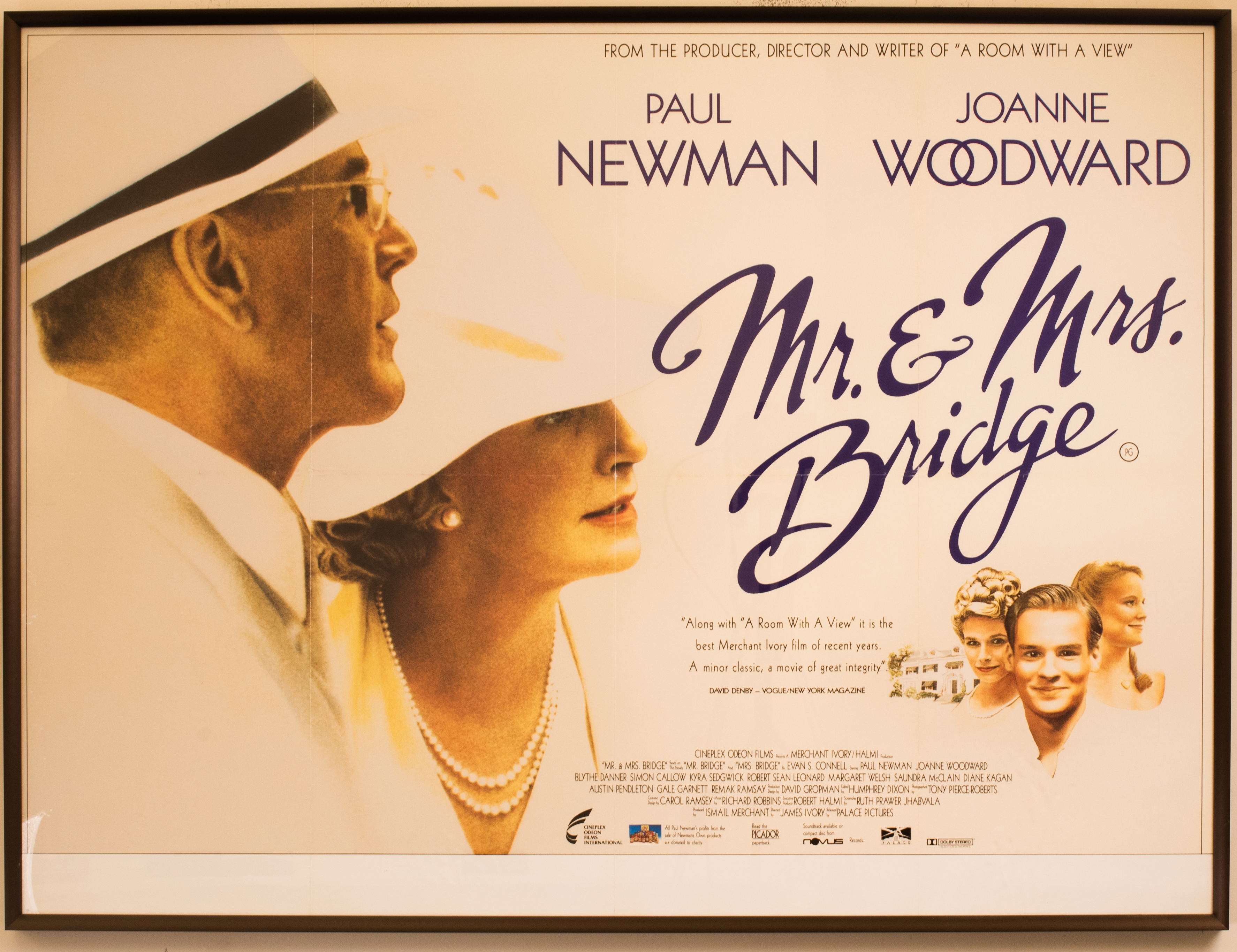 Mr. & Mrs. Bridge is a 1990 american dramatic film, based on the novel by Evan S. Connell. The film was directed by James Ivory, produced by Ismail Merchant and a screenplay by Ruth Prawer Jhabvala. The film starred real life couple Paul Newman and Joanne Woodward. The story follows the all american family living in the Country Club District of Kansas City, Missouri, during the 1930s and 1940s. The Bridges come to grips with changing social mores and conventions of the time. Mr. Bridge (Paul Newman) is a lawyer who attempts to stem the tides of his children's rebellion against the conservative views he holds to. Mrs. Bridge (Joanne Woodward) works to maintain an innocent view of the world, while dealing with her husband's emotional distance and her children's eagerness to adapt to a modern world. Detailed in this poster are the side views of Newman and Woodward. The couple are captured from the shoulders up, with their gaze directed to the right. Both are formally attired. Newman in a white fedora hat and light linen suit. Woodard with a white cloche hat, double strand of pearls and light garment.