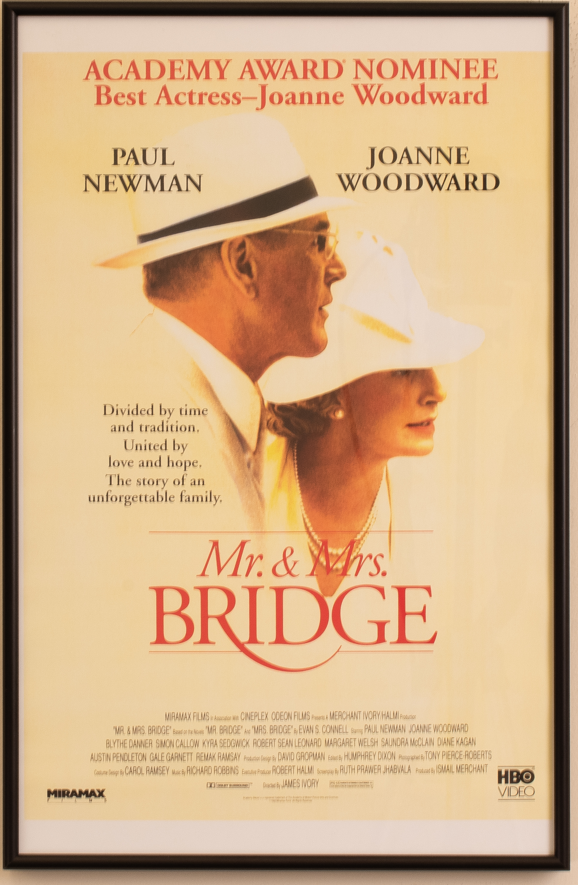 Mr. & Mrs. Bridge is a 1990 American dramatic film, based on the novel by Evan S. Connell. The film was directed by James Ivory, produced by Ismail Merchant and a screenplay by Ruth Prawer Jhabvala. The film starred real life couple Paul Newman and Joanne Woodward. The story follows the all-American family living in the Country Club District of Kansas City, Missouri, during the 1930s and 1940s. The Bridges come to grips with changing social mores and conventions of the time. Mr. Bridge (Paul Newman) is a lawyer who attempts to stem the tides of his children's rebellion against the conservative views he holds to. Mrs. Bridge (Joanne Woodward) works to maintain an innocent view of the world, while dealing with her husband's emotional distance and her children's eagerness to adapt to a modern world. Detailed in the left portion of this poster are the enlarged side views of Newman and Woodward. The couple are captured from the shoulders up, with their gaze directed to the right. Both are formally attired. Newman in a white fedora hat and light linen suit. Woodard with a white cloche hat, double strand of pearls and light garment. In the lower right a Colonial style house and the three children of the characters are depicted, starting left with Ruth Bridge (Kyra Sedgwick), Douglas Bridge (Robert Sean Leonard), and Carolyn Bridge (Margaret Welsh).