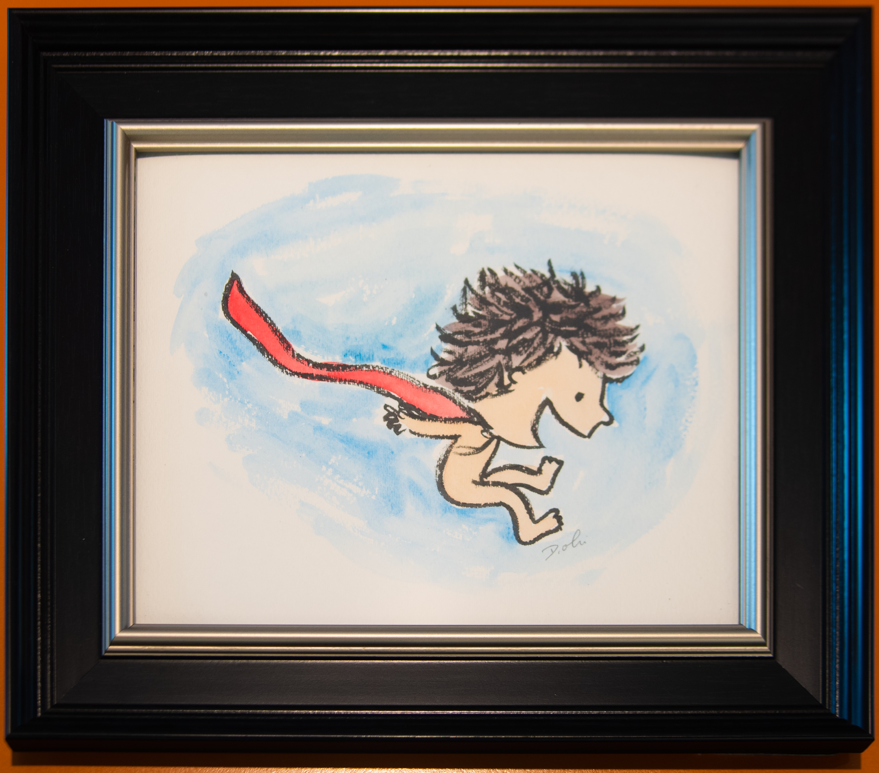 In this painting, the main character of Naked is captured mid-leap wearing only a red superhero cape and a gaping grin. The cape flies behind him as he throws caution to the wind while protecting the public and fighting crime. An ambiguous blue background helps provide context and grounds the work. Ridpath Ohi aptly captures the seemingly endless supply of energy so easily expended by a child on a mischievous mission.