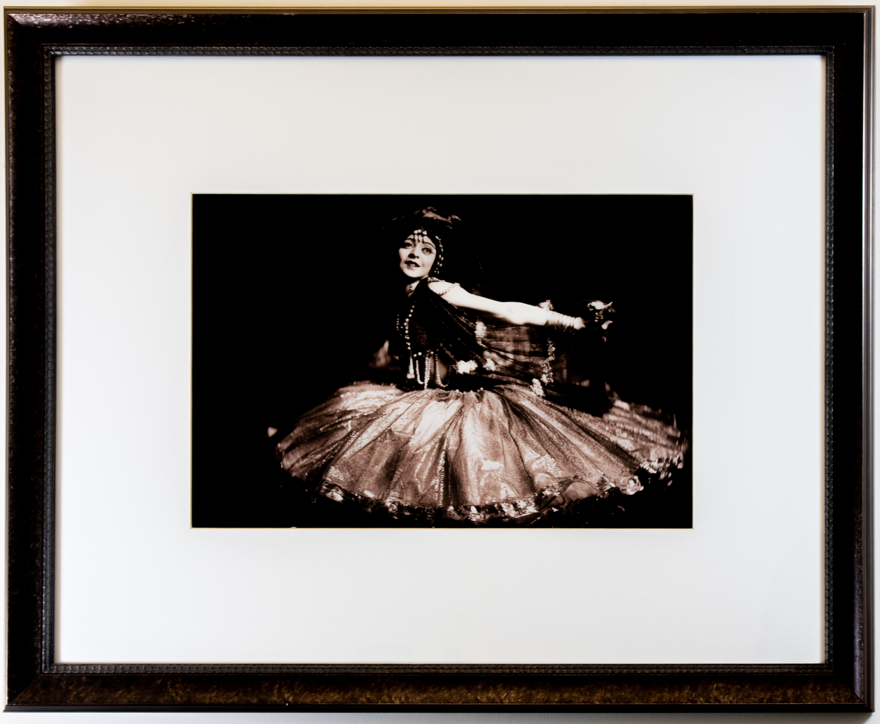 In 1915 and 1916, Ada Forman danced with Florence O'Denishawn on tour and partnered with Ted Shawn in numerous works including Danse Javanese and Nature Rhythms. The duo also performed in exhibition ballroom performances such as Dance Vogue. She eventually left O'Denishawn to appear solo in vaudeville on the Keith-Albee circuit. Forman successfully performed in Broadway revues, roof garden shows, and in the Greenwich Village Follies of 1922. She also appeared often in London during the 1920s to great acclaim. In this portrait, she sits on the floor and gazes thoughtfully off to her left. A layered crinoline peeks out from underneath her gathered brocade lame' skirt. Her bralette is bedecked with strings of pearls leaving her midriff scandalously exposed for the time. She extends her left arm behind her and holds an ornately embellished shawl. Her left hand is dripping in jewels and her arm is sumptuously covered in thin bangle bracelets. Her right hand is poised atop her bejeweled turbaned head and holds the other end of the shawl. A thin sliver of light behind Forman's body lends depth to the composition. The highly reflective surfaces captured in dramatic lighting by Hixon invite the viewer's eye to continuously travel from point to point through the work.