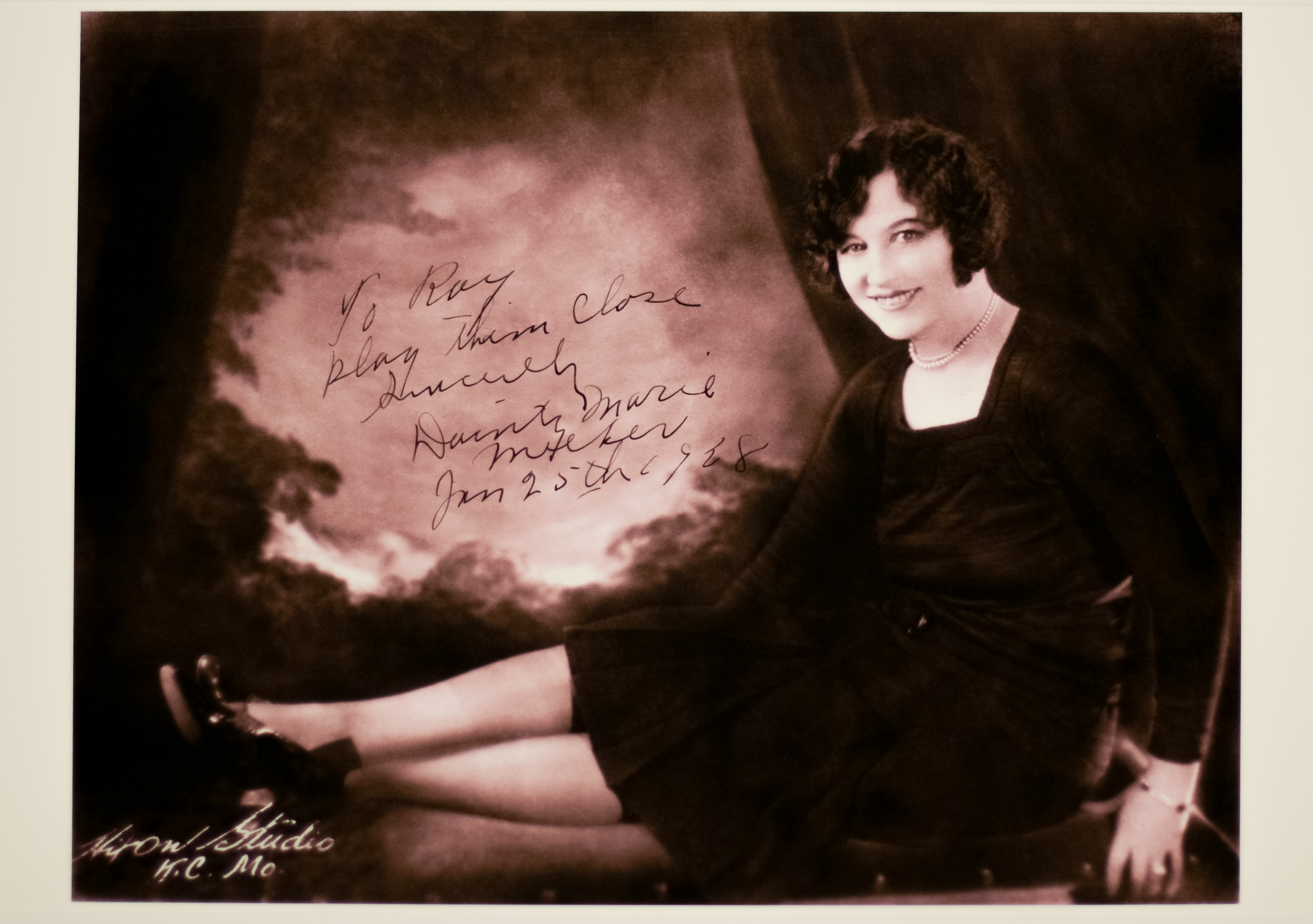 Dainty Marie Meeker was a vaudeville star and physical fitness icon in the early 1900s. She was originally from Leavenworth, Kansas, where her father was a guard at the prison. She rose to fame quickly for her multi-talented performances on the Broadway stage. She was cited in a 1913 issue of The Leavenworth Times for an act where she opens singing in a beautiful evening gown then disrobes into a body suit. She then climbs a trapeze on stage, and performs a number of acrobatic stunts. She became known for her strength after an altercation with 'mashers' while walking down Broadway in New York City who tried to stop her. She responded with a few swift self-defense moves that threw the masher off his feet and out of Meeker's way. She kept walking and bystanders took the story to the news. In this photograph, she is seated with legs stretched out before her on what appears to be a stage set up with a landscape prop in the background. She wears a black ensemble with a pleated skirt, patent leather heels and a short, wavy haircut popular of the era. She smiles at the camera, her figure framing the message written over the photograph that reads "To Ray- Play Them Close. Sincerely, Dainty Marie Meeker". The message is dated January 25th, 1928, but it is unclear if the message was written at the same time the photograph was taken.