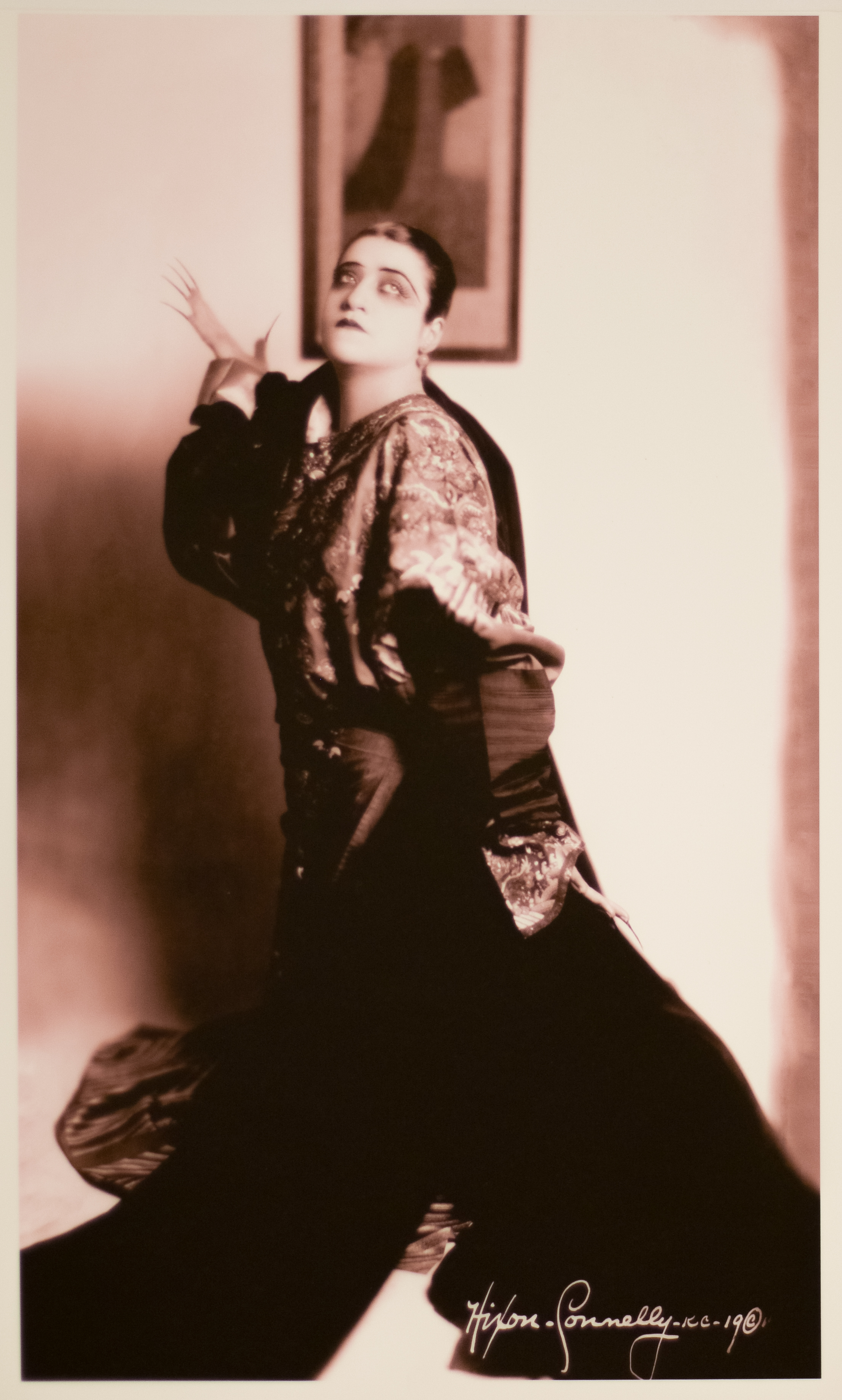 Dorothy Jardon was an American opera singer and actress. She sang soprano in "The Wedding Trip" in 1912 and played the role of Bimoula in the musical comedy "Oh! Oh! Delphine!" in 1913. She is pictured in lavish pose and dress, looking upward while casting one hand with a dramatic flare near her face and the other to her posterior. Both movements have been emphasized by tapered lines extending from her fingers creating the illusion of long fingernails. Her nails, in addition to her overdrawn eyebrows and eyelashes, are embellishments made by Hixon in the developing process. She is shrouded in heavy, ornately detailed fabrics, completing an image of wealth, beauty, and class. The bottom right of the portrait is the signature "Hixon- Connelly- KC- 19©".