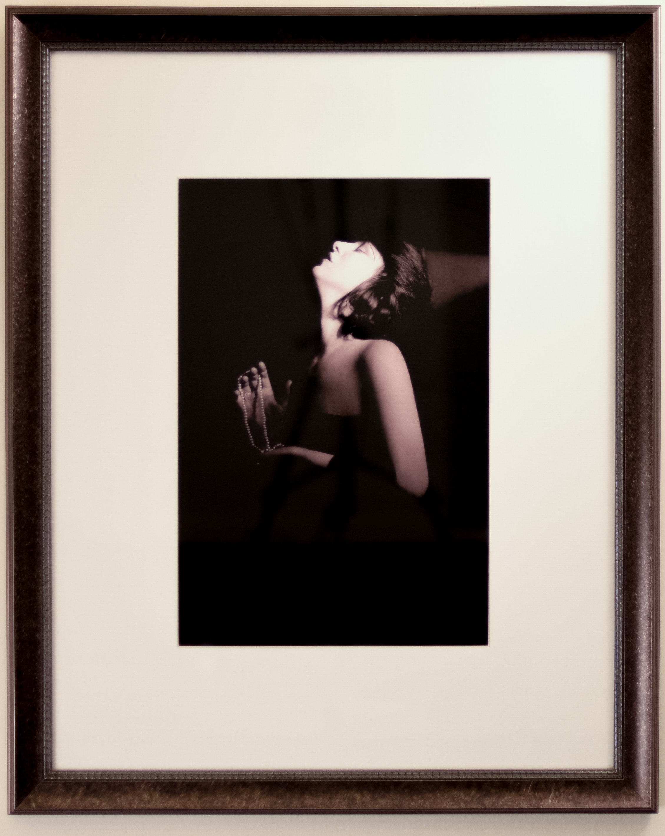 Evelyn Nesbit Thaw was an artist model, a chorus girl, and an actress. As a model, she posed for notable artists such as James Carroll Beckwith and Frederick S. Church. She was also on the cover of many popular magazines in the early twentieth century which made her face highly circulated and recognized. She moved on to theater with her first gig as a chorus line singer for the Broadway show "Florodora" (1899). She then landed a role as Vashti in "A Wild Rose" (1902) for which she received a great deal of press attention as the next up and coming star. Although the viewer sees only her starkly contrasted profile in this photograph, her features and lustful posture make her recognizable. She holds a string of pearls between her hands with head tilted back, eyes closed, and appeal heightened.