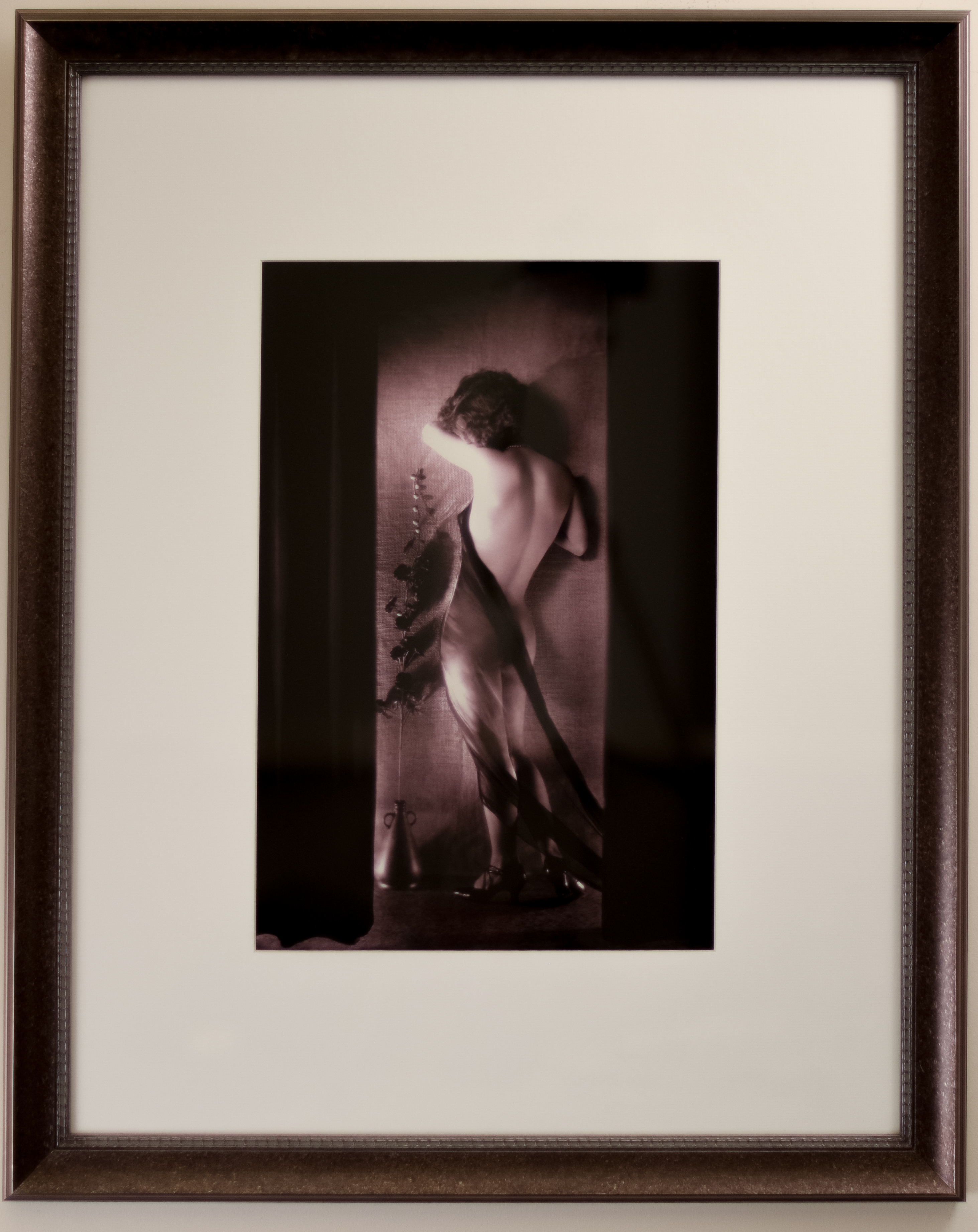 The figure in this study is speculated to be Grace Darling. Grace Darling was a silent film actress best known for her leading role in "Beatrice Fairfax" (1916) as Beatrice herself, the editor of a love advice column. The film's significance comes with it being inspired by "Ask Beatrice Fairfax" the first newspaper advice column of its kind introduced in 1898 by Mary Miller, and as it was of the first film series consisting of 15 independent episodes that aired weekly. This shot captures Darling in the opening of stage curtains standing against a burlap-sheathed wall. She holds a conventional artist model pose, exhibiting the back side of her figure while bending her arm to conceal her face as if shielding it from the light, or to hide her identity. A scarf of sheer material wraps around her figure and obscures the forms of her backside ever so slightly, although concentrated highlights outline the outside curvature of her hip and thigh. These effects were likely applied by Hixon in the development process through a series of chemical photo manipulations. Next to Darling is a faux floral arrangement in vase. By looking through the curtains at the figure, Hixon creates a shot that evokes an implicit sense of voyeurism in the viewer, as if one has happened upon her in private distress.