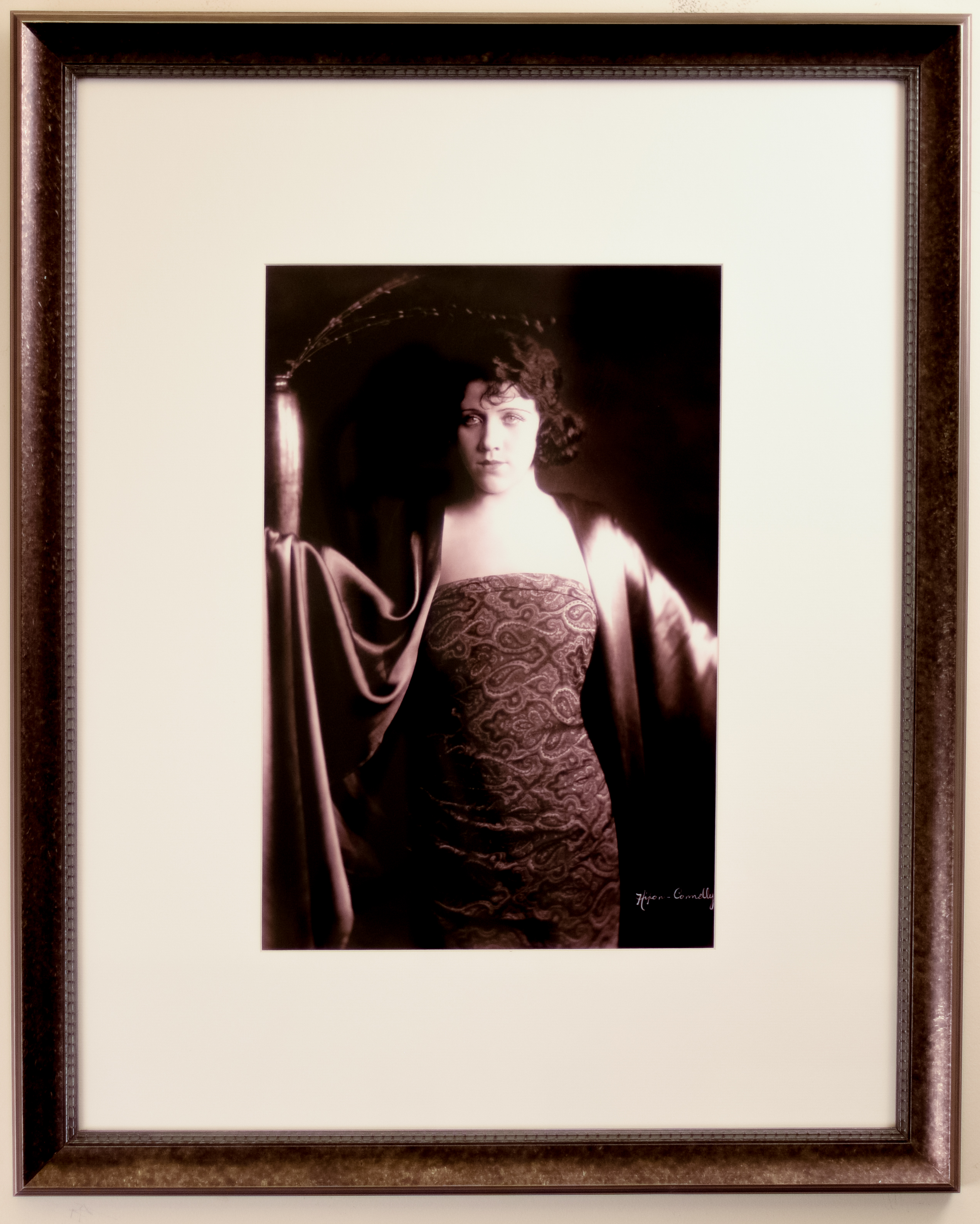 Flo Lewis was a vaudeville entertainer. She is recognizable by her crystalline eyes and long eyelashes. In this three-quarter view photograph, a paisley patterned fabric wraps her figure while a satin sheet drapes over her arms. She holds out a vase with a few thin limbs of foliage coming out of it. The vase appears to be a material extension of the satin fabric as their color, texture, and reflectivity are nearly identical. Although she holds out the vase as an offering, her eyes mesmerize with their gaze.