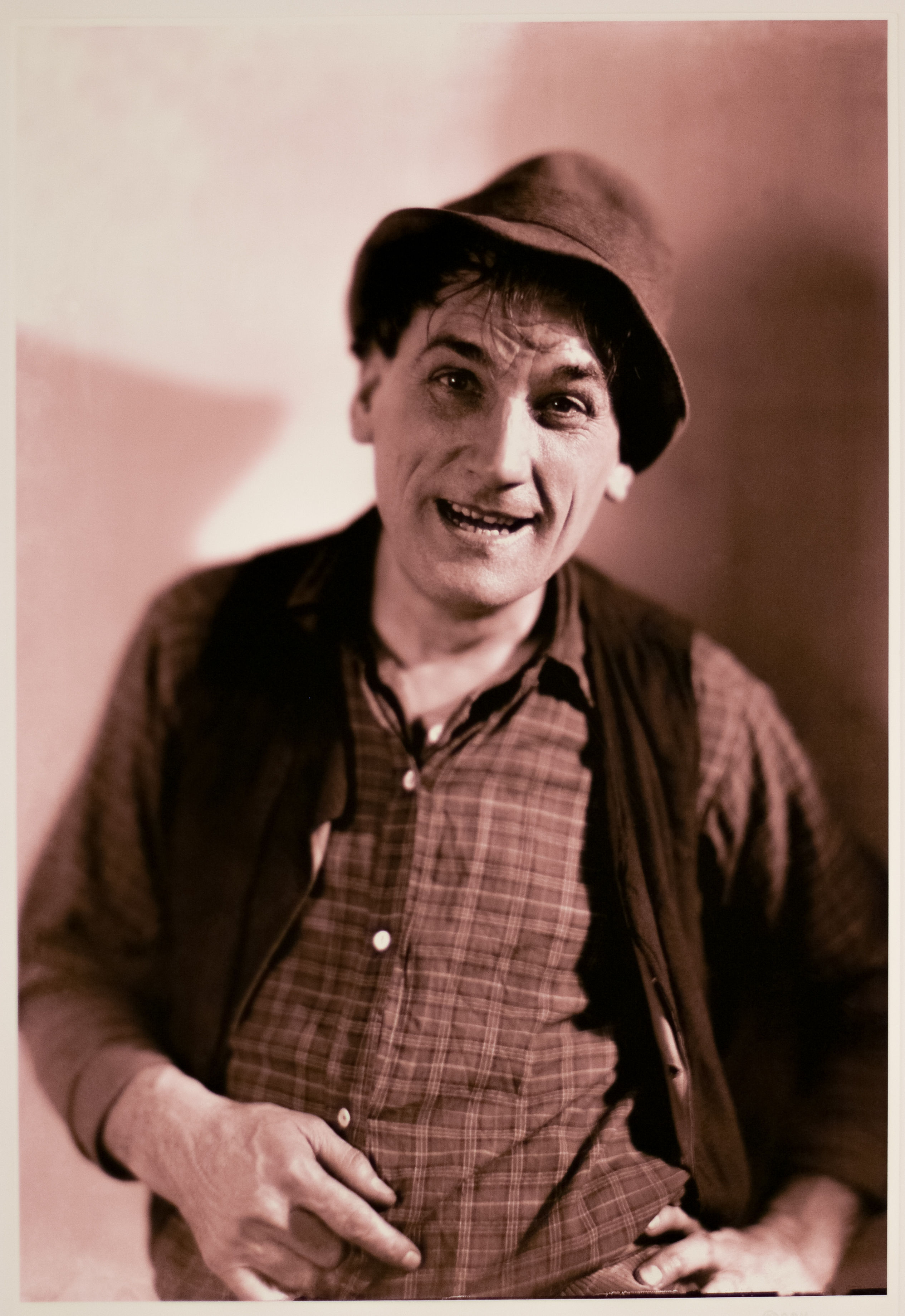 George Beban was born in California in the year 1873. Beban was an actor, writer, director, producer, and editor of over thirty films through 1910 to the 1920s. Beban had been a minstrel performer with the legendary team of Weber & Fields. Beban personal success was achieved producing and co-writing the play "The Sign Of The Rose" in 1911. He recreated this role for Thomas Ince in 1915 in a silent film renamed "The Alien". It was done as a multi-media event with Beban live on stage interacting with the screen presentation. Beban would appear live on stage after reel 4, for 18 minutes, in a exact copy of the florist shop from the film. He became a star in the 1910's playing poor but honest immigrants who succeeded despite the odds. Beban’s son, George Beban Jr. followed in his father’s footsteps as an actor from 1915 (child) to 1949. George Sr. died from a horse fall in 1928. In this portrait Beban is casually dressed in a somewhat wrinkled plaid shirt, modest vest and care worn hat. Beban is captured from the waist up, and is centered in the print. Beban's expression appears like he is in mid conversation, with a open smile and jovial eyes. Beban positions his left hand grasping his hip, as his right hand rests casually on his stomach.