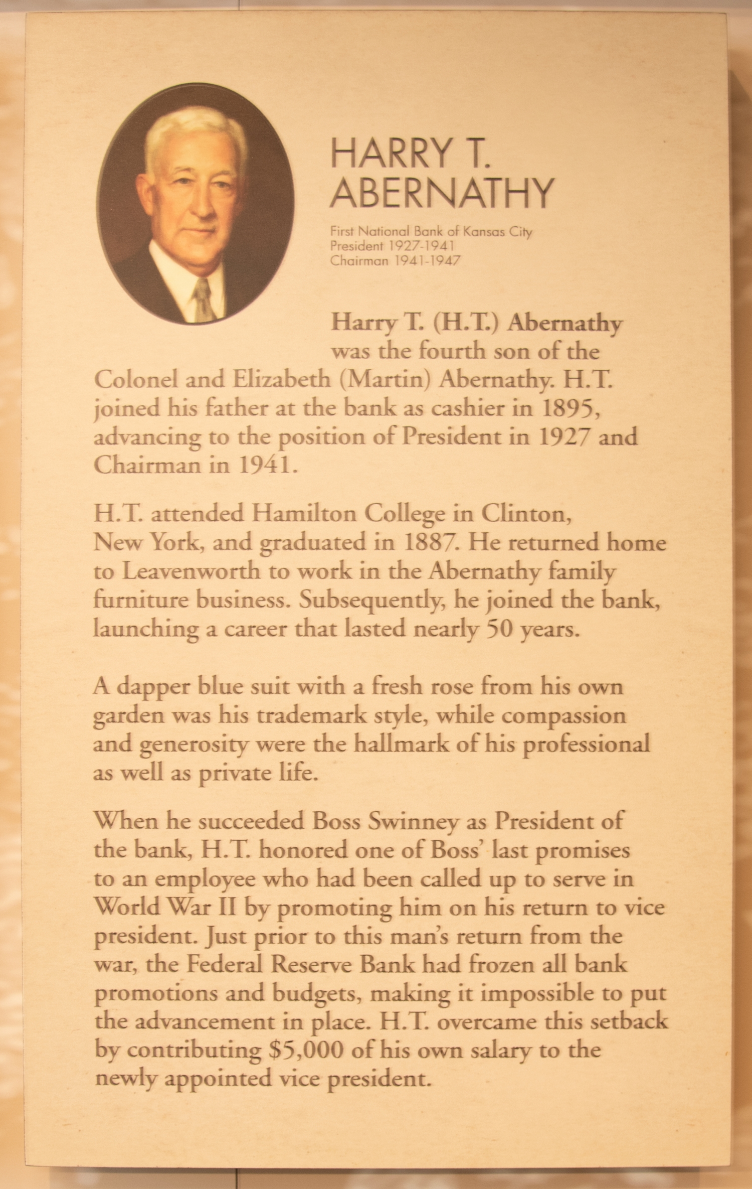 Harry T. Abernathy was born in Leavenworth, Kansas on 23 May 1865 to Col. James L. Abernathy. Harry's father James, was the pioneer furniture manufacturer of the West. Harry came to Kansas City and became cashier of his father's company. Harry held the position for eight years. In 1895, he became the assistant cashier of the First National Bank. Later, he was the treasurer of Park College for four years.