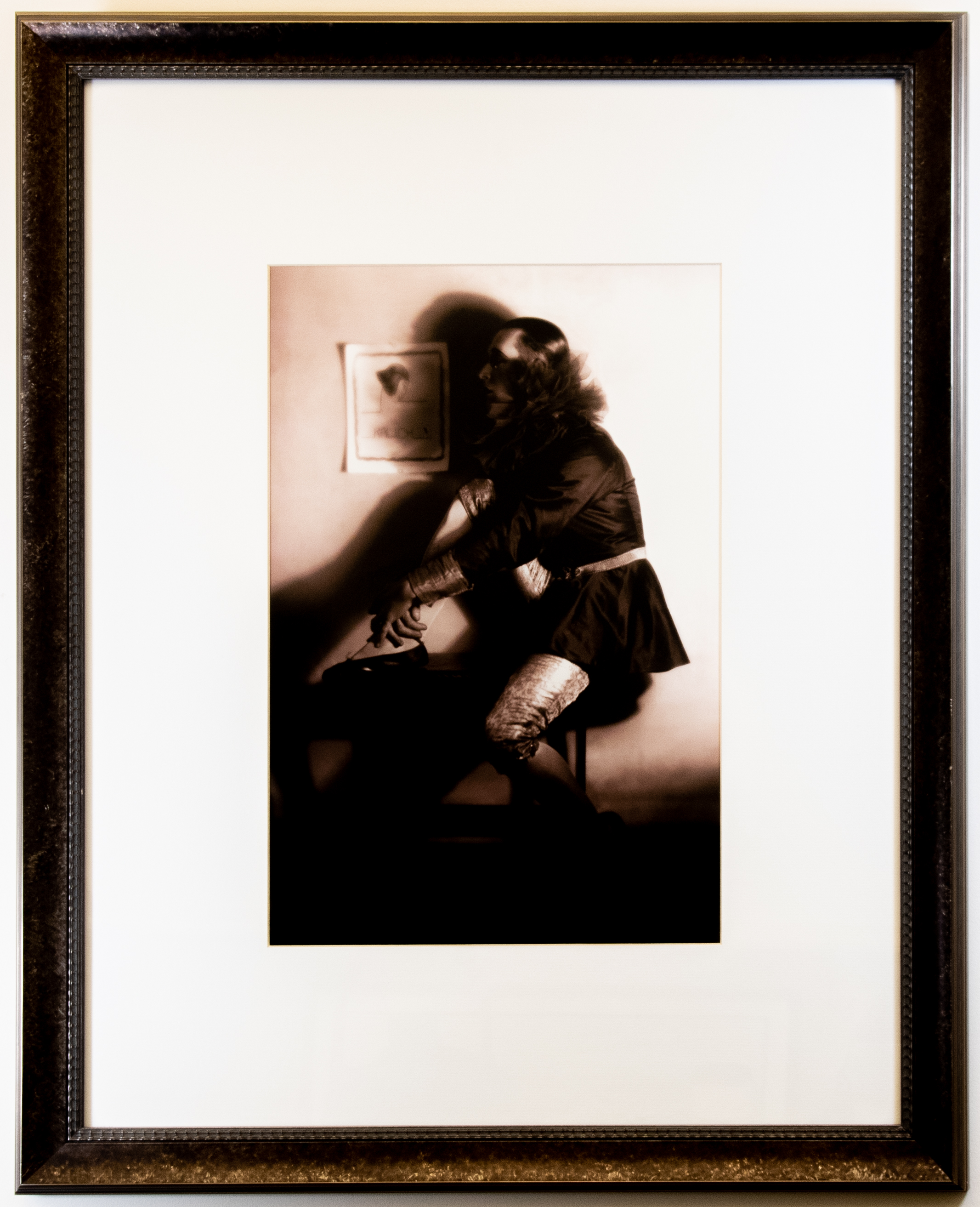 This solitary moment captured by Orval Hixon commemorates the Herbert Kinney and Corrine Kalich pantomime and dance act. Kinney sits on a low bench with one leg up and one leg on the floor. He is wearing a short dark tunic belted at the waist and accentuated by a tuille ruff. His brocade knee-length britches are offset by tights and dark slippers. His hair slicked-back hair accentuates makeup typically worn by pantomimes. He sits close to the wall and facing a poster of an illustration of a woman with an art-deco hairstyle. Under the depiction, is the name Kalich. Hixon lit the scene with one light which casts a heavy shadow of Kinney that nearly abuts Kalich's poster on the wall-intimating they are physically distanced, but never really apart.
