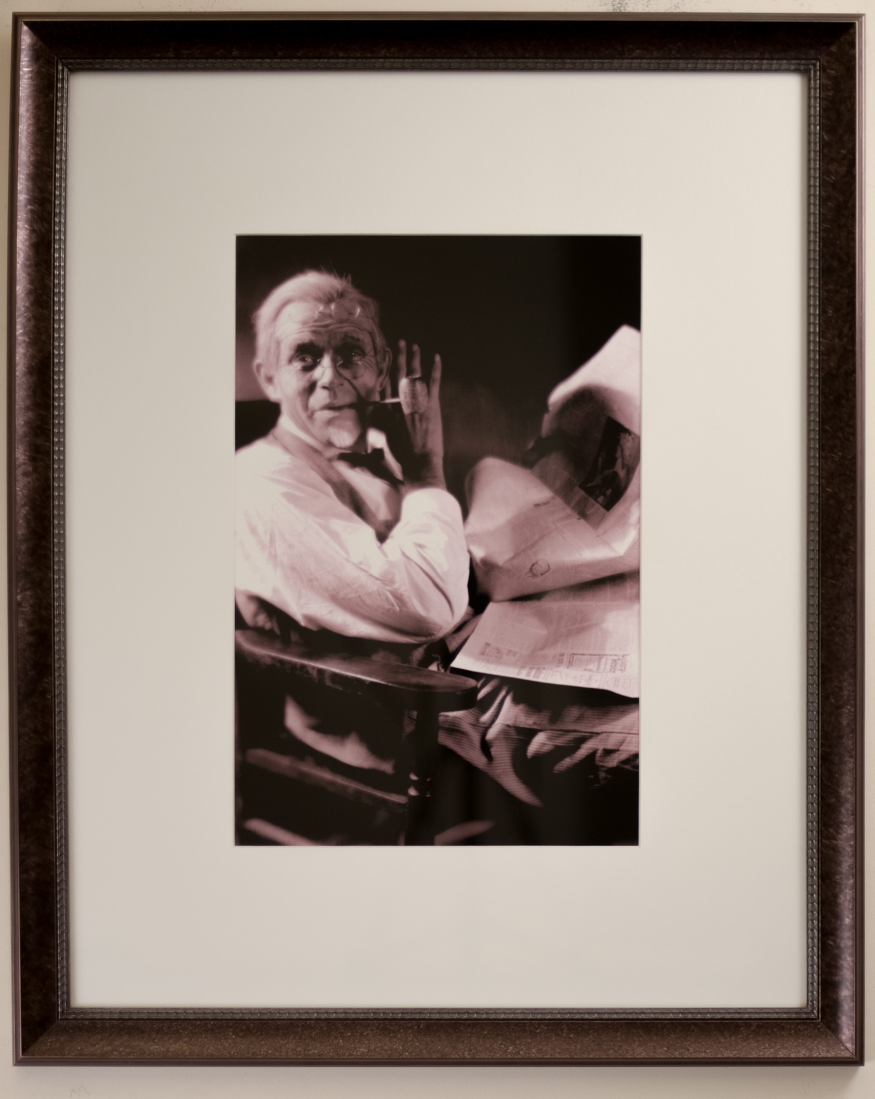 Jack Clifford, born Virgil James Montani, was originally from Geneo, Italy. Clifford’s vaudeville fame came from his live performances, both as an actor and dancer. Clifford was noted for his marriage to Evelyn Nesbit in 1916, and after a fifteen year separation ended in divorce in 1933. Clifford died on November 10, 1956, at the age of 76, in New York. In this portrait Clifford is captured in a relaxed atmosphere, seated with an opened newspaper on his lap. Clifford is attired in casual clothing, a white shirt, a black ribbon bow tie, suit vest and pinstripe pants. A few whimsical props accentuate Clifford's overall appearance, a corn cob pipe and two sets of spectacles. The eye glasses are curiously positioned as one pair is properly placed on the bride of his nose while the secondary set rests absentmindedly on his head. Clifford's gaze is directed slightly to the right, as he positions his left hand behind his right ear, in an attempt to amplify his hearing. The wooden chair, in which Clifford sits, appears care worn with slight scuffing on the arm of the furniture. The background is very dark, which accentuates the central figure.