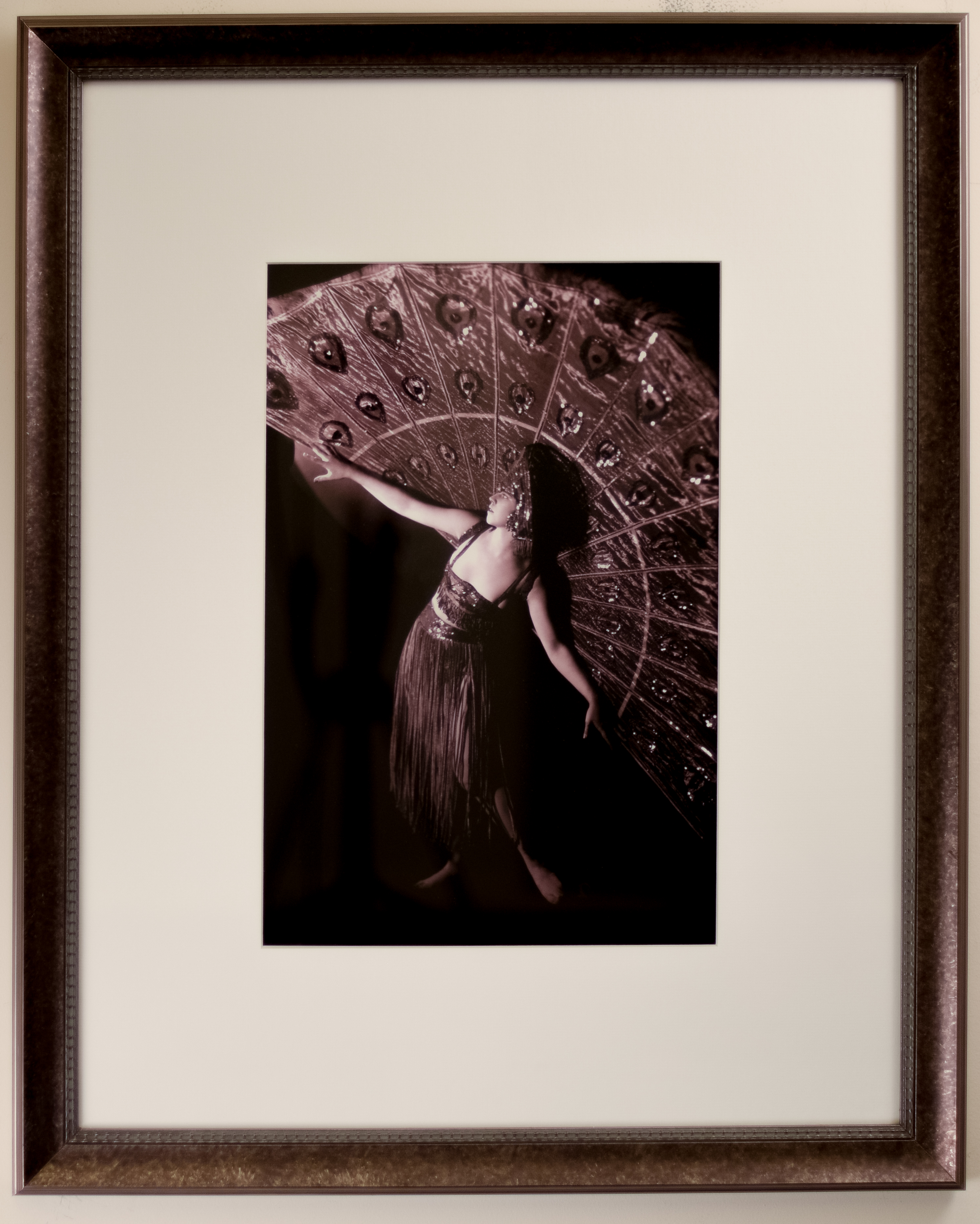 This portrait depicts Janette Hackett, acclaimed dancer of the early twentieth century. Hackett’s first career performance came as a teenager when she appeared in the Shubert’s Passing Show. During this time, under the tutelage of Kitty Doner, Hackett learned to dance. After studying Hawaiian and “Oriental” dance, she went on a five-week tour performance with Nora Bayes and later replaced Billie Shaw in the established act of “Seabury and Shaw”. Hackett received great reviews for the twenty-week engagement, and as a result, William Seabury extended an offer to help Hackett establish a new act. The new routine would pair her with Harry Delmar, with whom she performed in a dancing duo with for many years and later married. Hackett had many notorious, highly successful acts and continued to dance and choreograph for many years. Among her legacies are several “soundies” featuring the “Janette Hackett Dancers” or the “Janette Hackett Girls”. This photograph is dominated by the large fan prop strapped on to Hacket's shoulders, resembling the feathers of a peacock. The fan is extravagant with lightweight shimmering material that is particularly active under light, even in the still of a photograph. Hacket extends her arms along its bottom edge while leaning back, exposing herself to the light in the room. She wears a flashy headpiece, brassiere, and skirt with fringed lower edges. The array of textures and materials of this costume would have been dazzling in show, especially when embodied by Hacket's dance expertise.