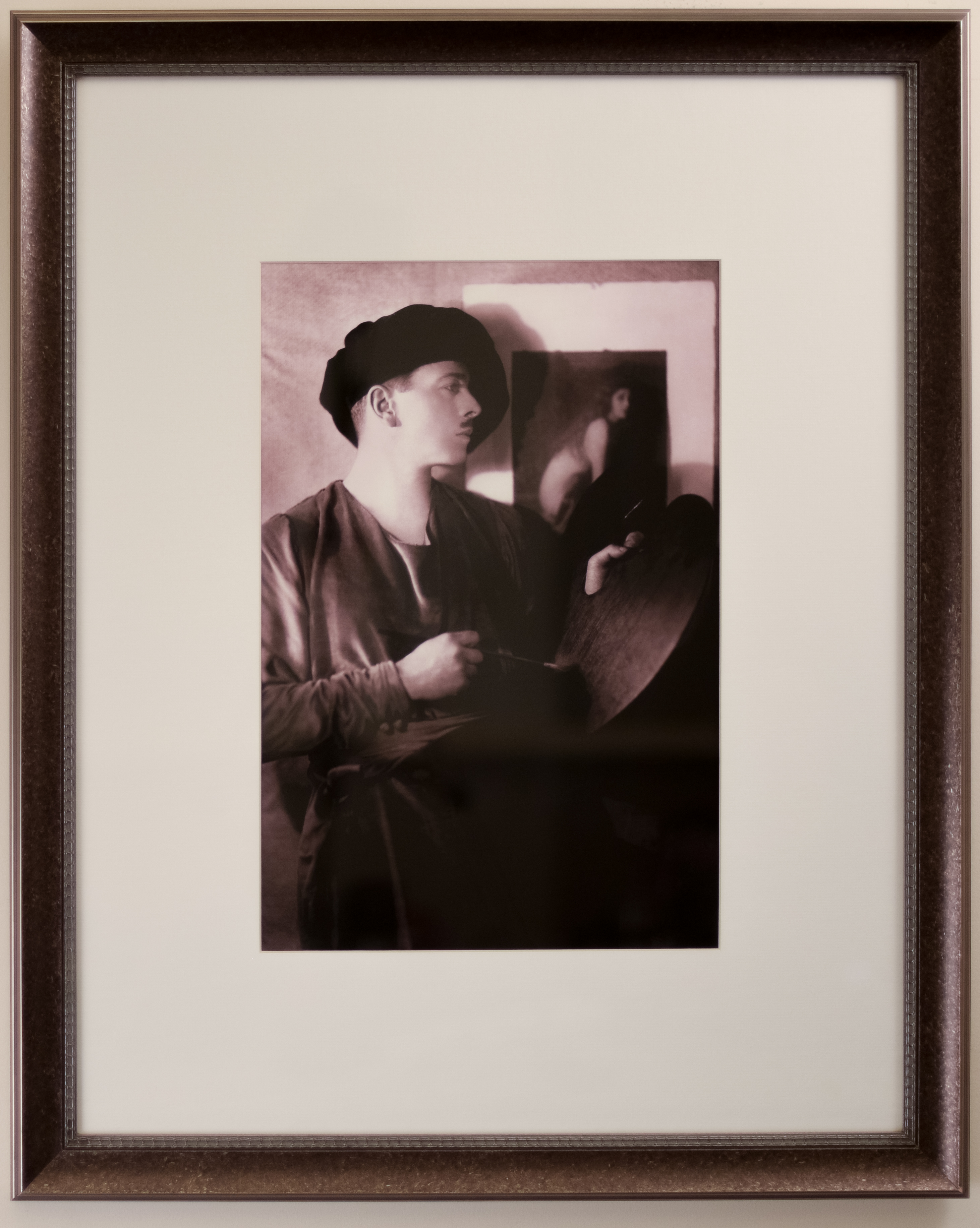The identity of this man is unknown, but his persona is not. He is dressed here as the archetypal French painter in an exaggerated beret, precise mustache, painters frock, paintbrush, and wooden paint palette. Although there is no paint on his materials, one can assume that he is in the midst of working on the piece hanging on the wall behind him. He stands poised with brush to palette and head turned to the side, offering a dramatic profile of his character.