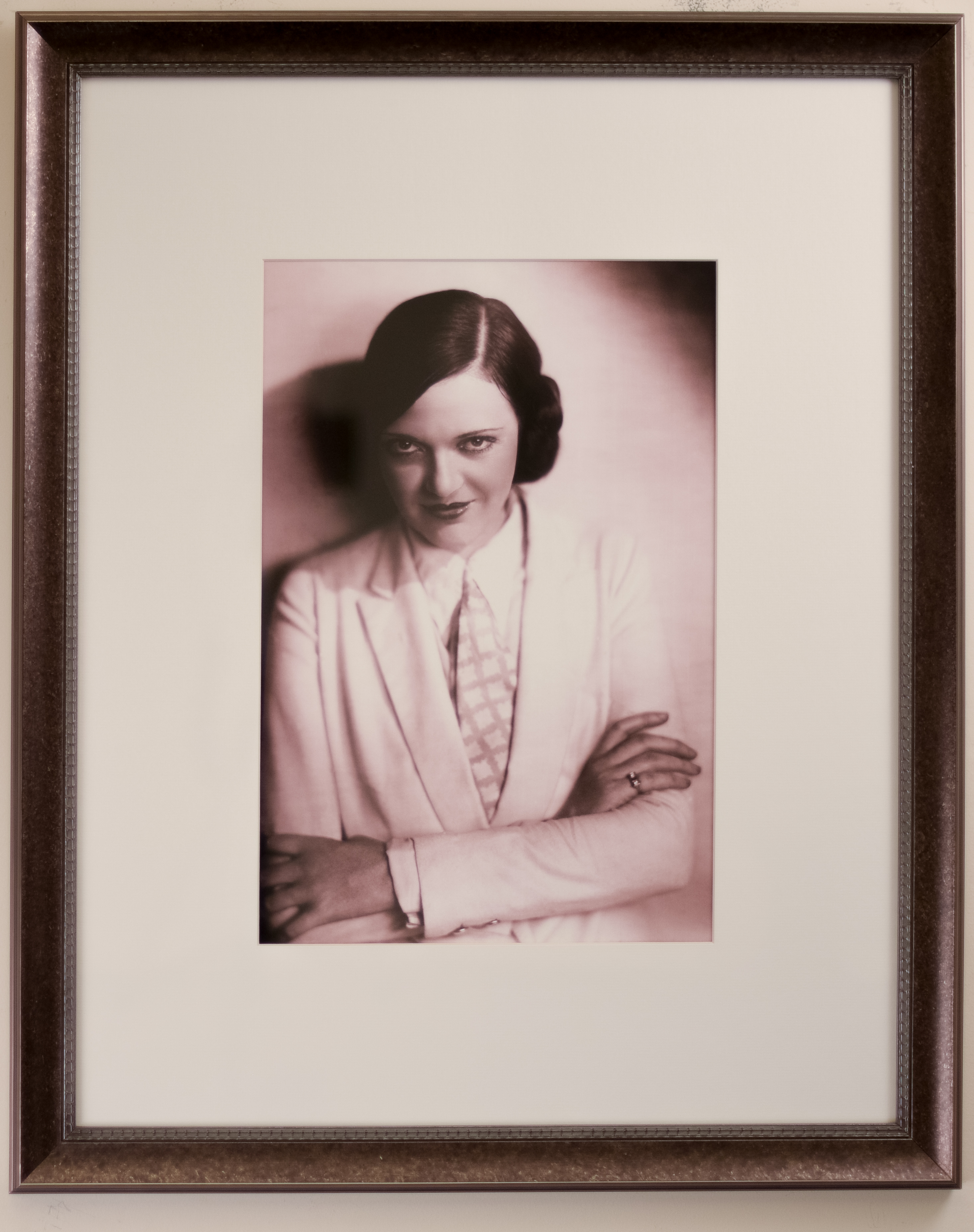 Miss Egan, born with the name Mary Florence Cecilia Egan, was a violinist and bandleader during the 1920s through the 1930s. Her career started from the pit orchestras of Hollywood productions until she formed her own all-female orchestra in 1924 called Babe Egan's Hollywood Redheads. The group played in vaudeville along the West Coast and eventually went on tour in the Orpheum vaudeville circuit for many years. In 1933, they toured Europe with a 16 piece band, which included pianist Dorothy Sauter and saxophonist Geraldine Stanley. Egan retired in the 1940s. She is captivating in this photograph, sporting a crisp white suit jacket, formal tie, and conservative hairstyle that initially convey her poise. Although with her arms crossed and head tilted downward, she extends a piercing gaze through to the viewer that, when accompanied with her smirk, complete a mischievous and commanding look about her.